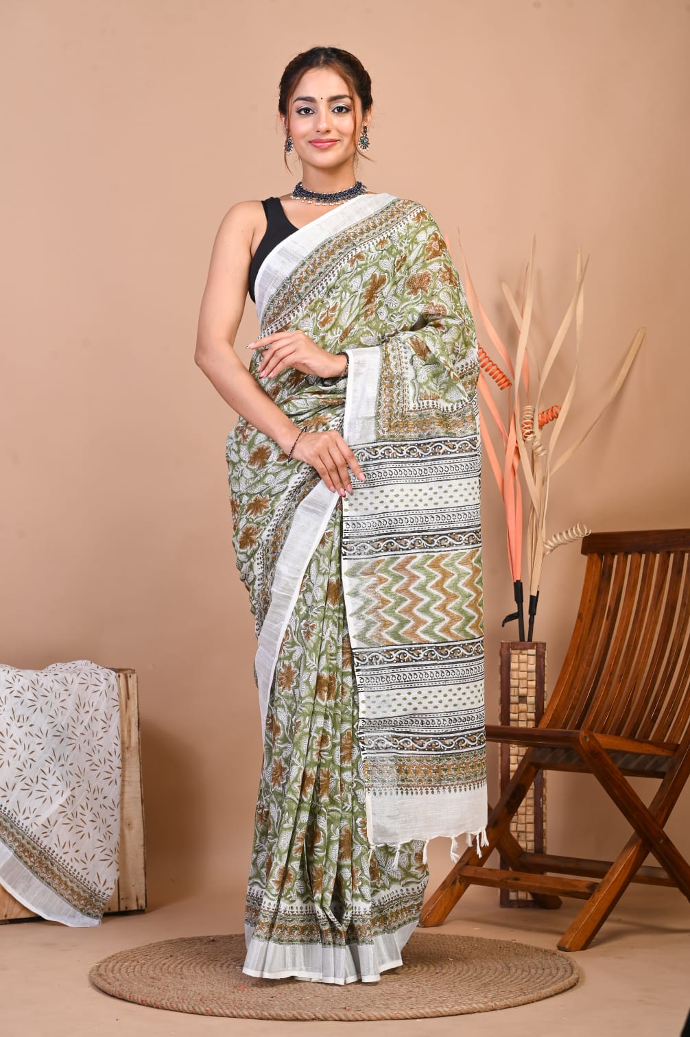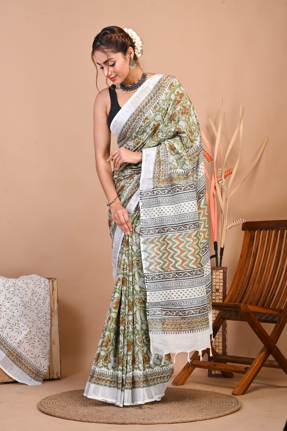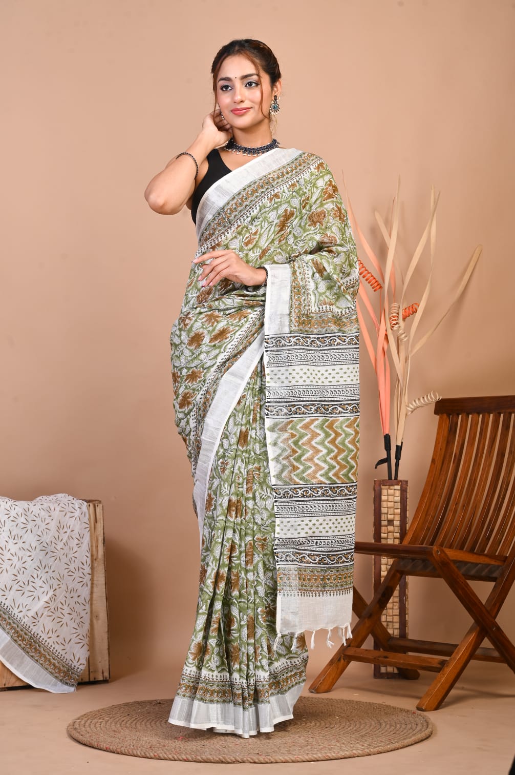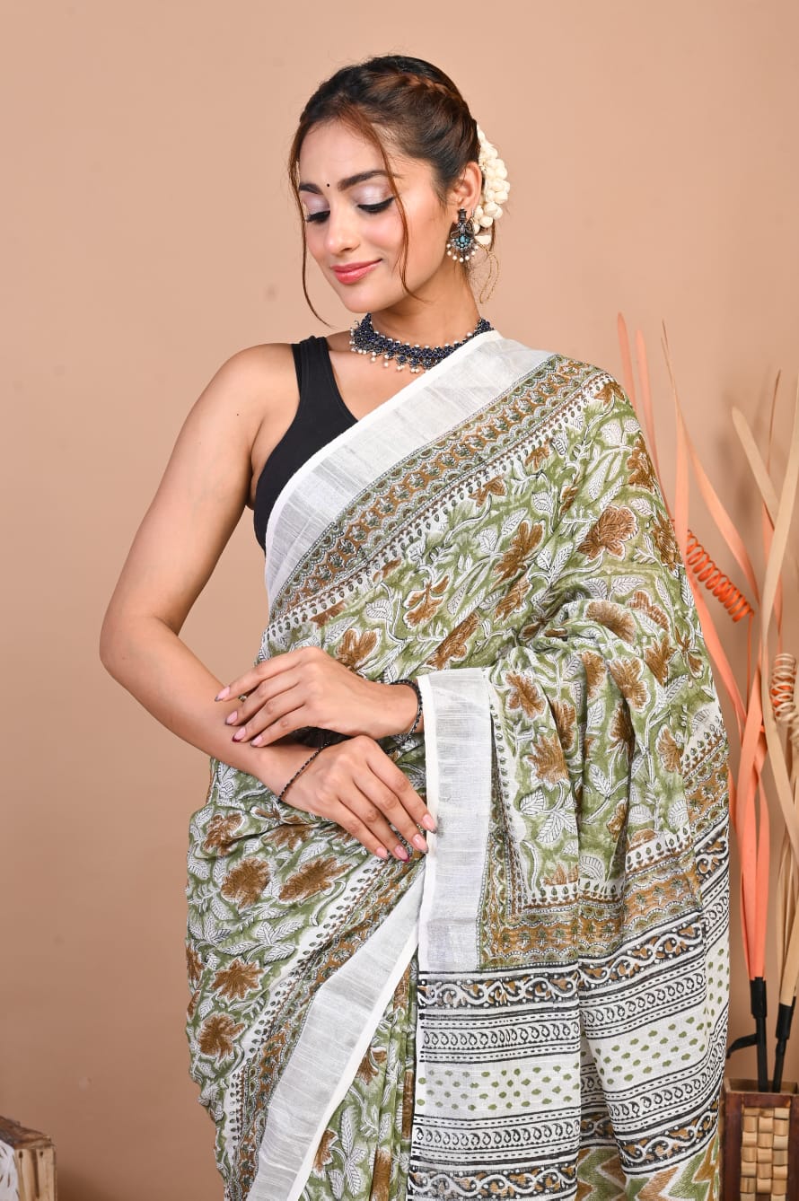 Samantha White Green Color Linen Cotton Hand Block Floral Printed Saree with Unstitched Blouse Piece