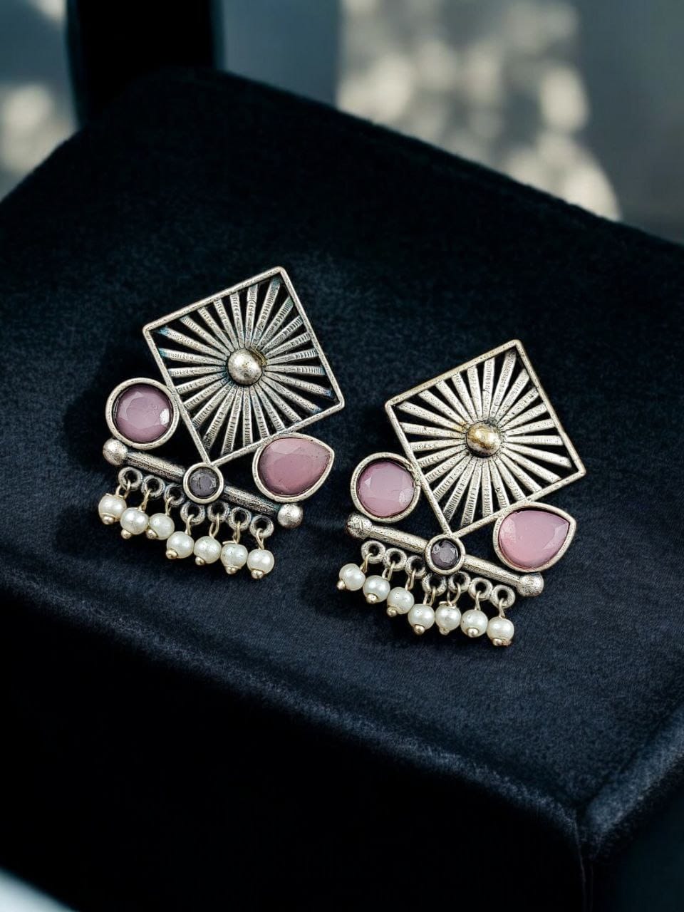 Pink Ethnic Indian Stone Work Silver Oxidized Earring Set Pearl Beads Stud Earrings for Girls