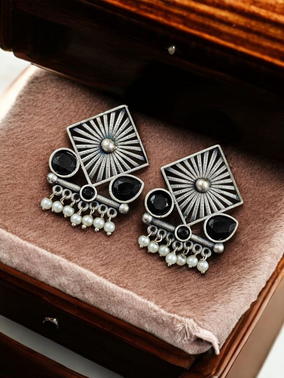 Black Ethnic Indian Stone Work Silver Oxidized Earring Set Pearl Beads Stud Earrings for Girls