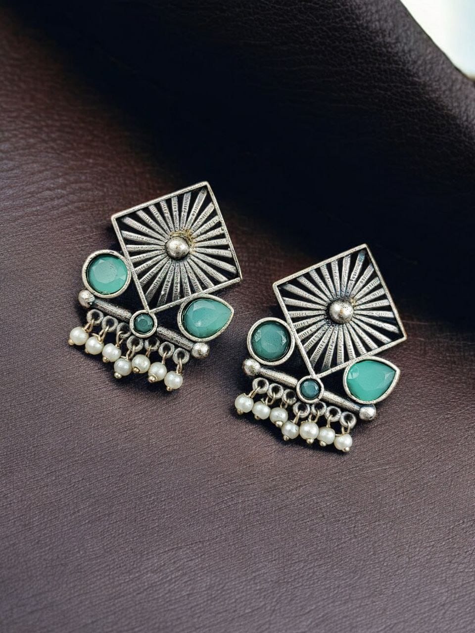 Mint Ethnic Indian Stone Work Silver Oxidized Earring Set Pearl Beads Stud Earrings for Girls