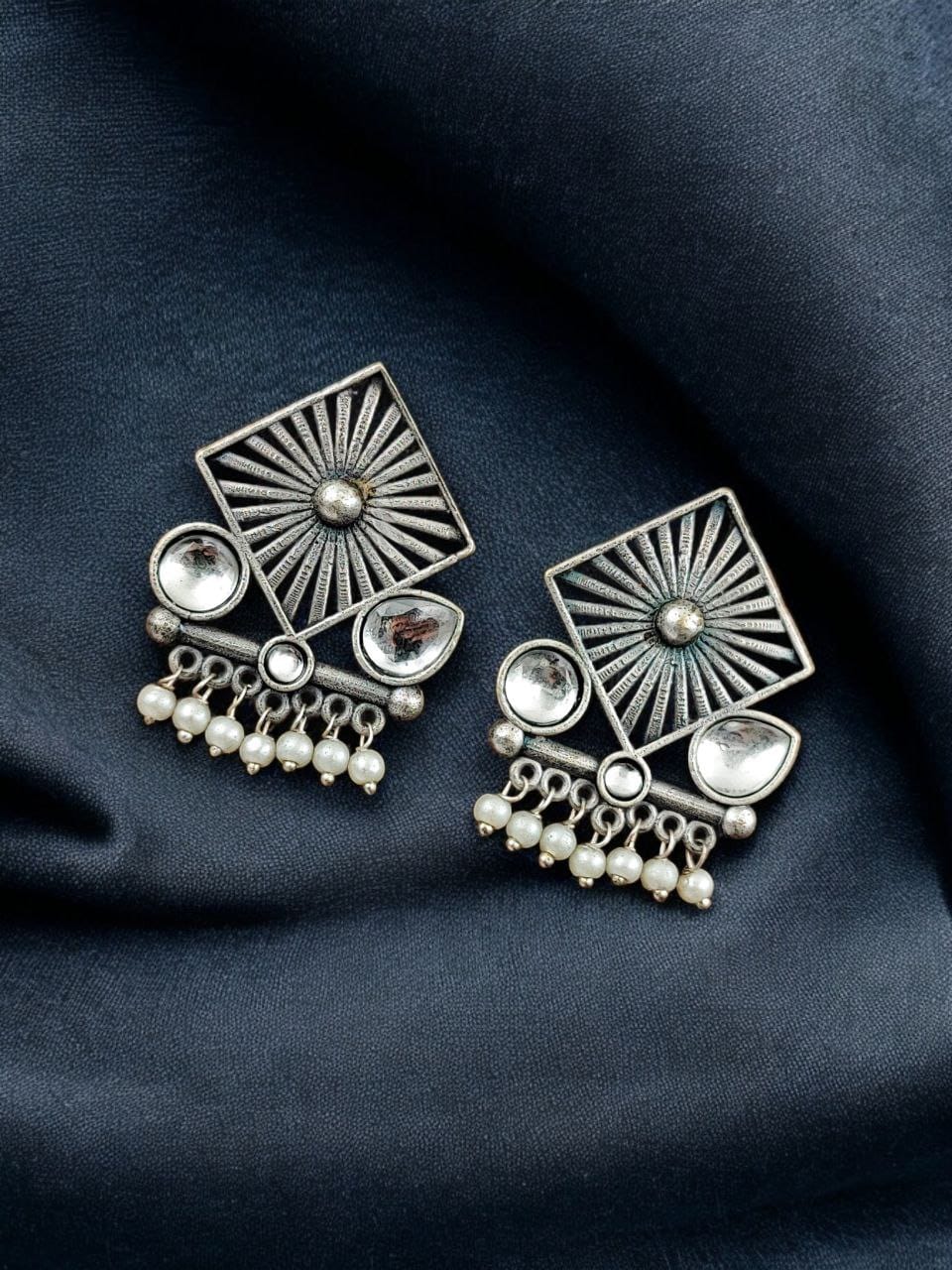 Ethnic Indian Stone Work Silver Oxidized Earring Set Pearl Beads Stud Earrings for Girls