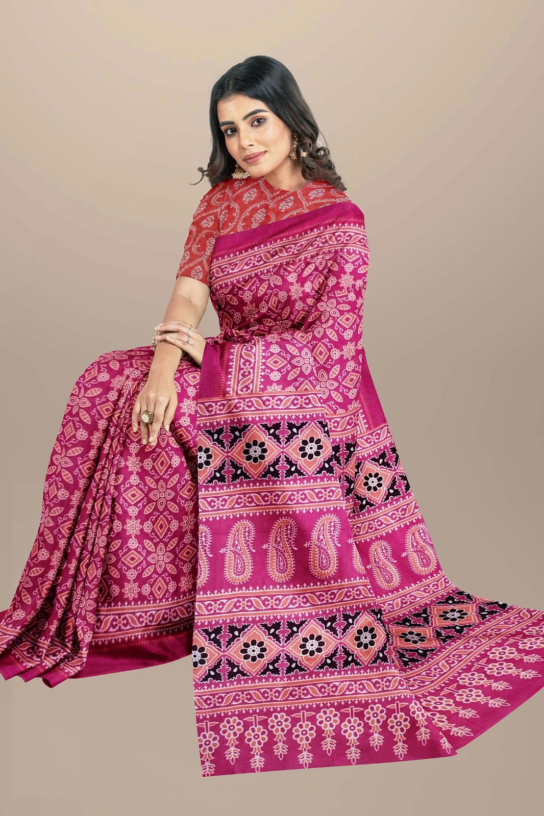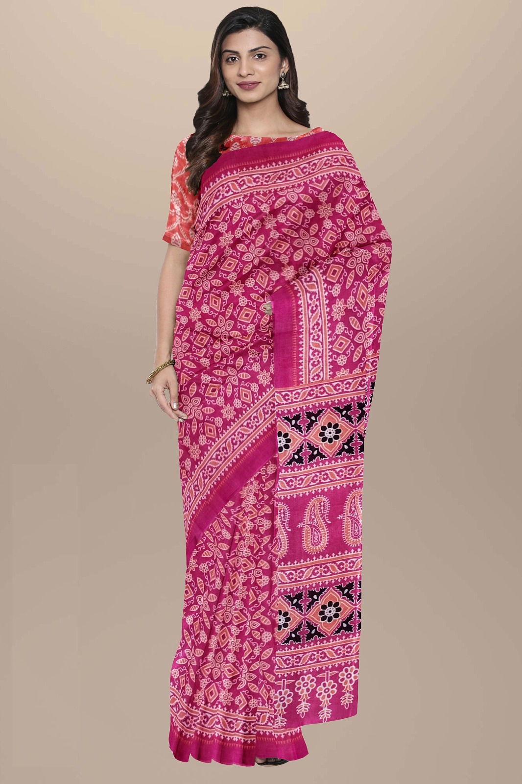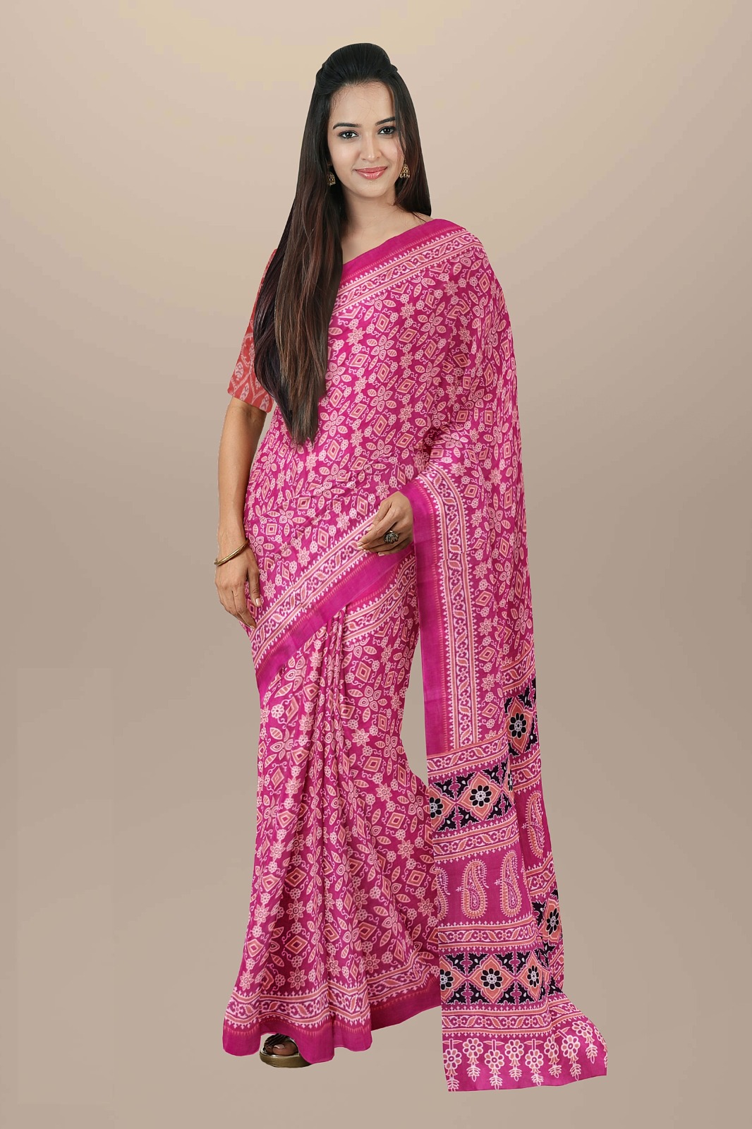Pink Multi Color Rajasthani Printed Chanderi Silk Saree with Unstitched Blouse Piece