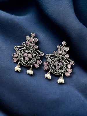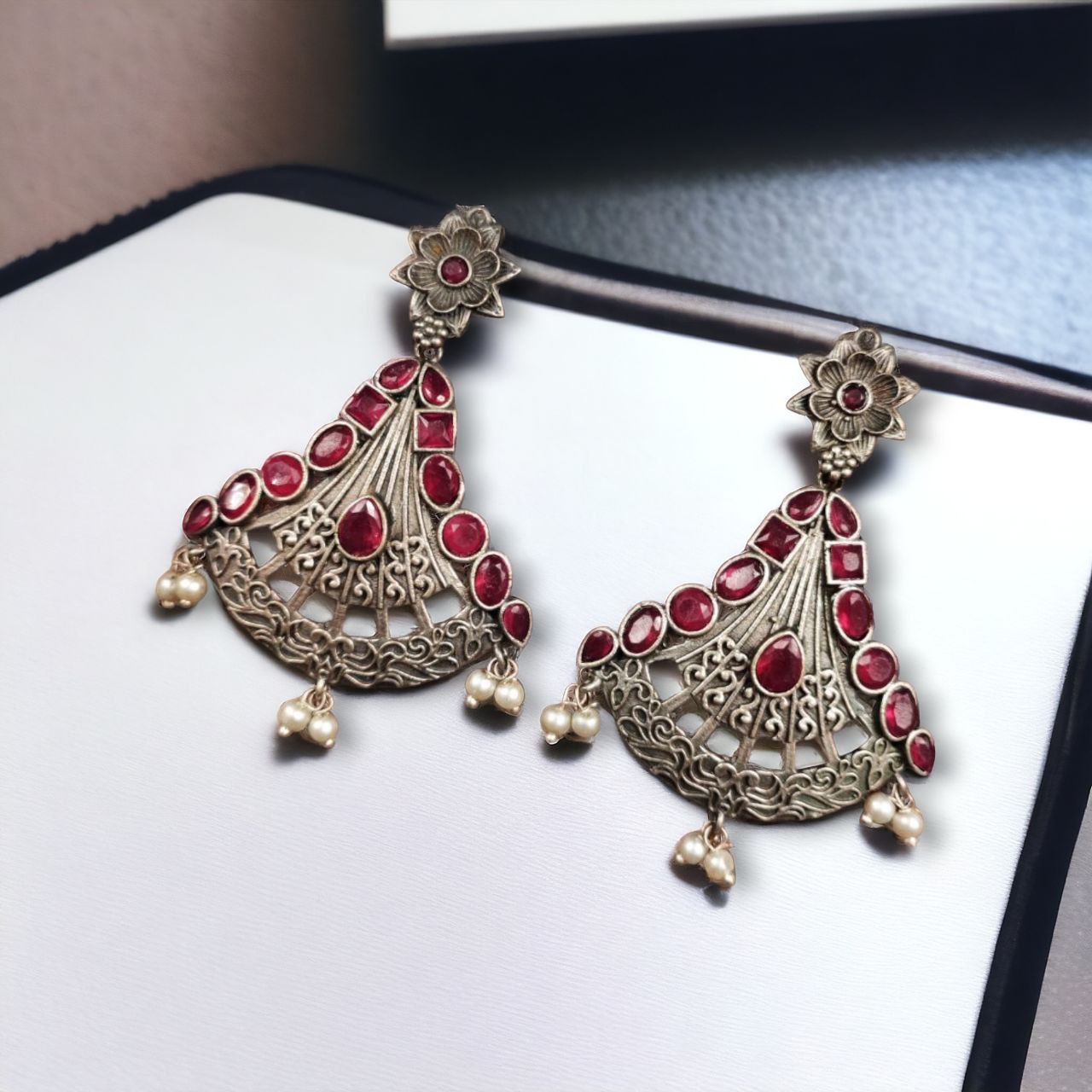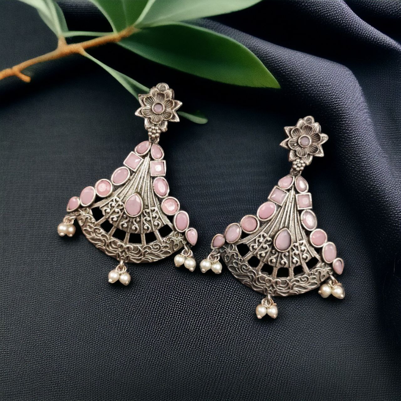 Babypink Traditional Stone Work Silver Oxidised Dangler Earring Pearl Beads Drop Pakistani Earring Set