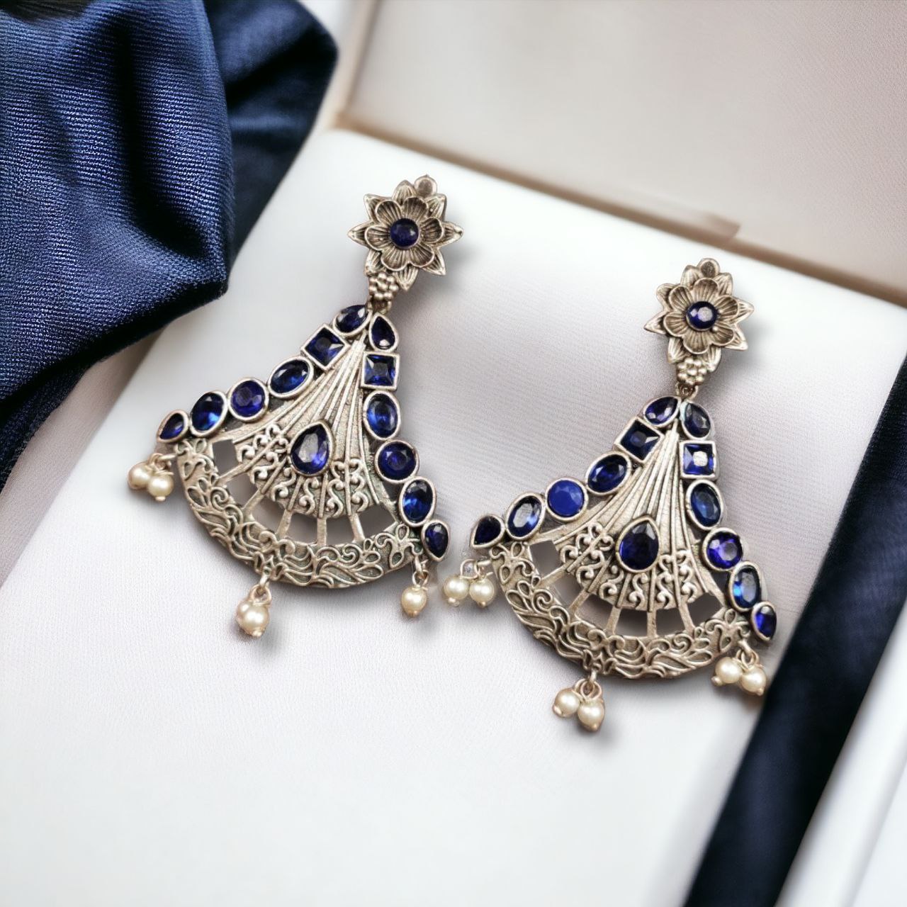 Blue Traditional Stone Work Silver Oxidised Dangler Earring Pearl Beads Drop Pakistani Earring Set