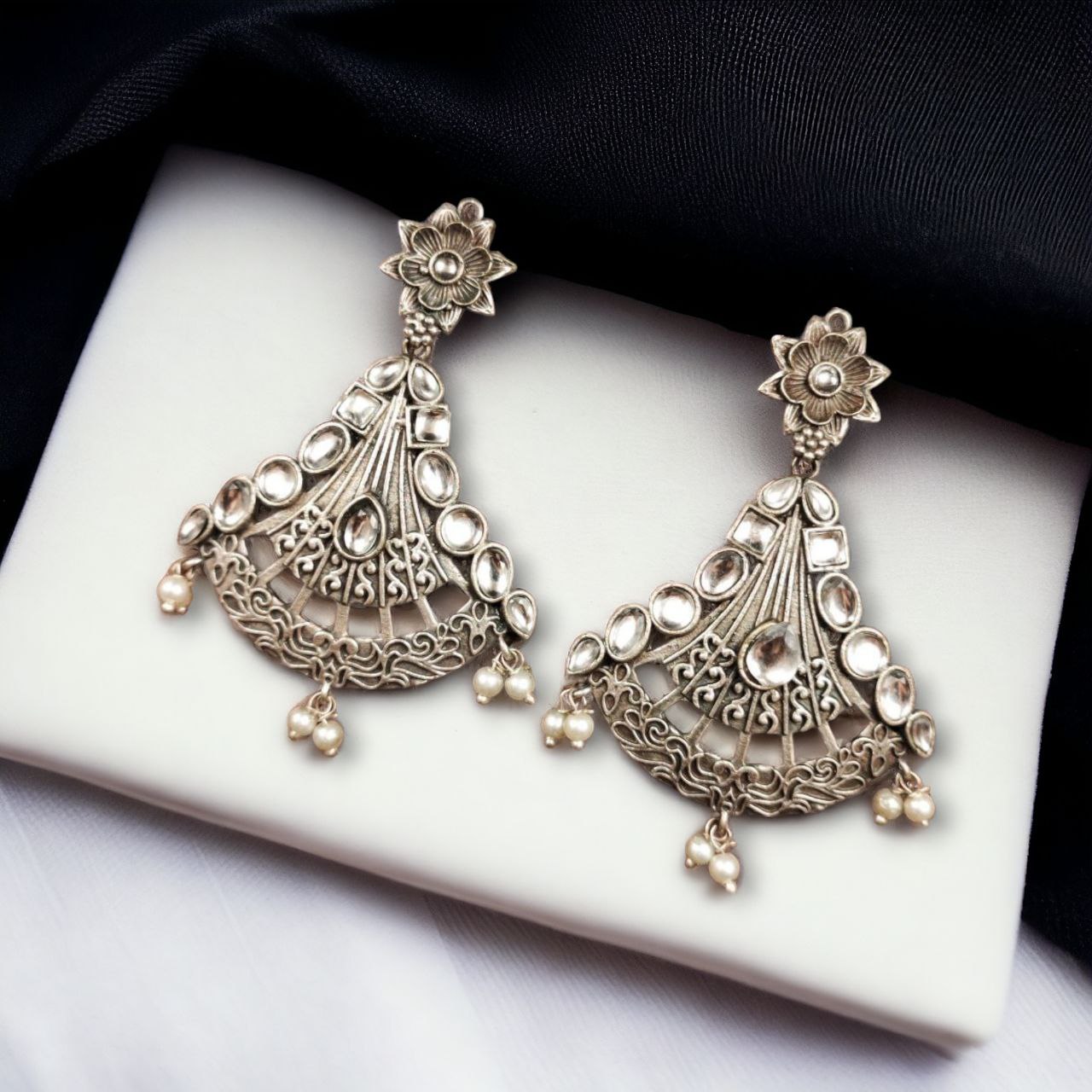 Traditional Stone Work Silver Oxidised Dangler Earring Pearl Beads Drop Pakistani Earring Set