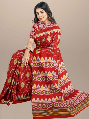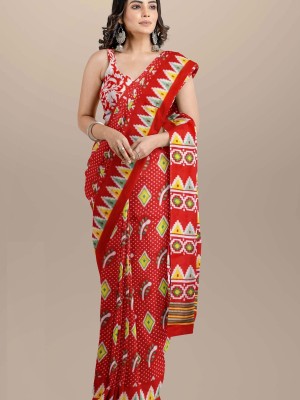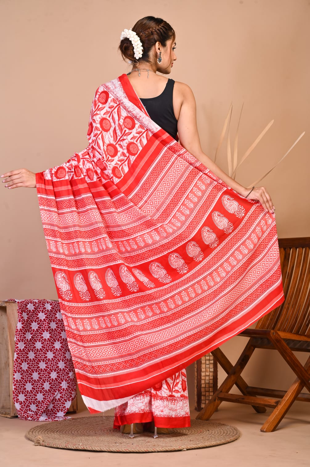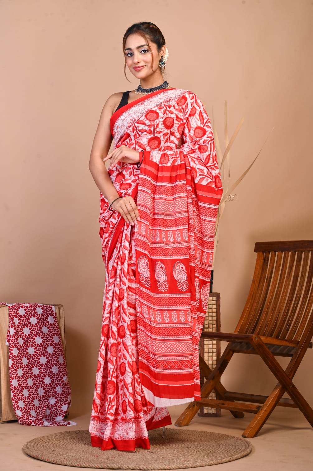 Red Color Floral Block Printed Cotton Mulmul Mul Saree with Unstitched Blouse Piece