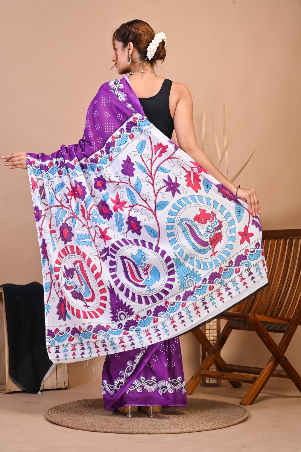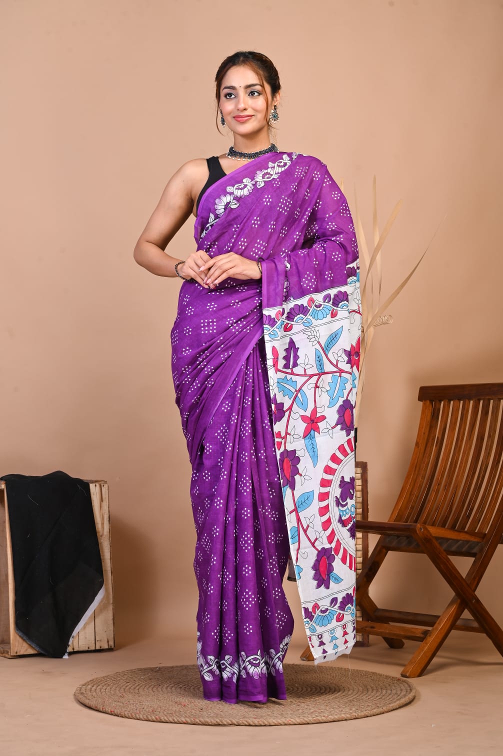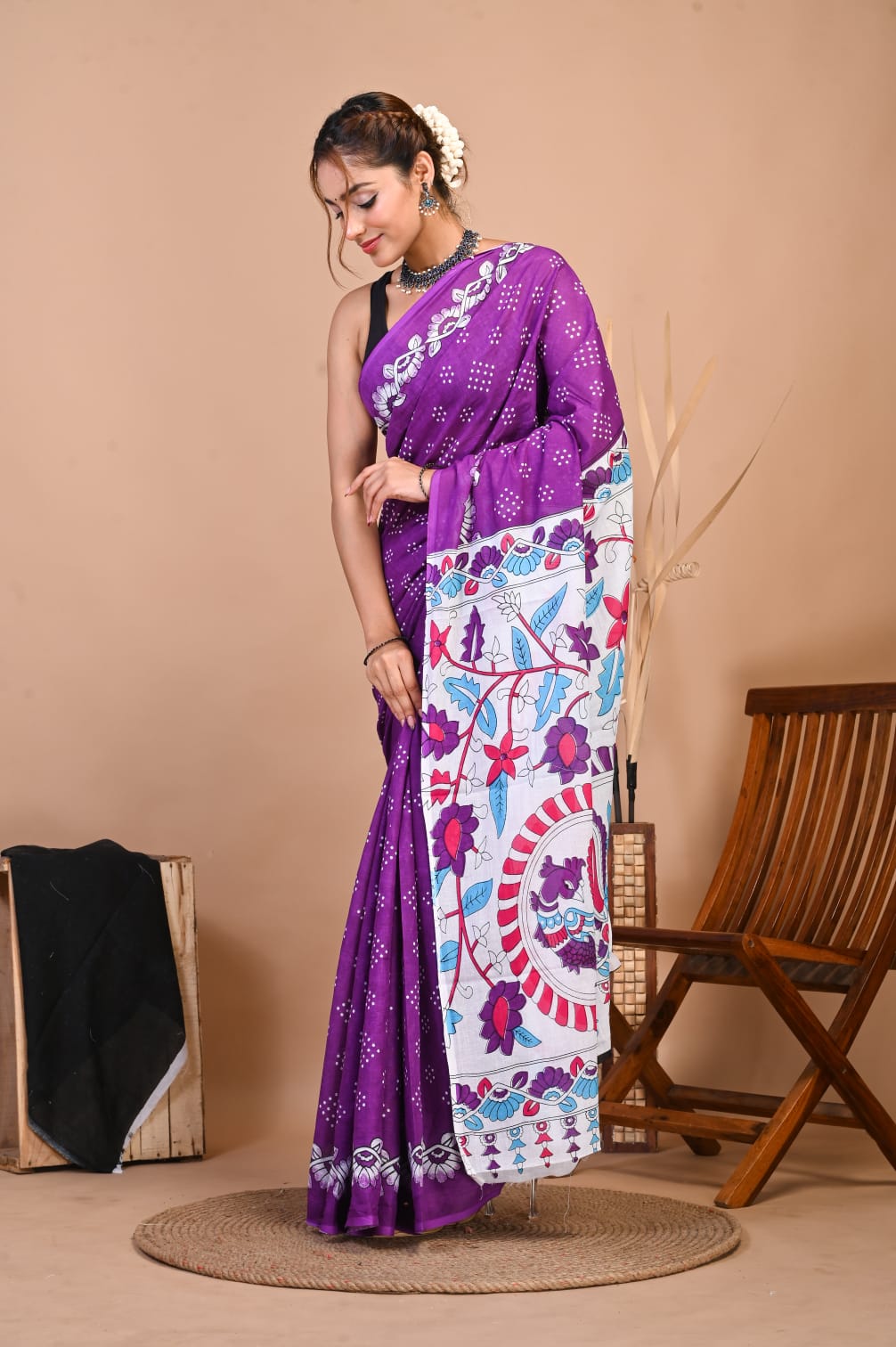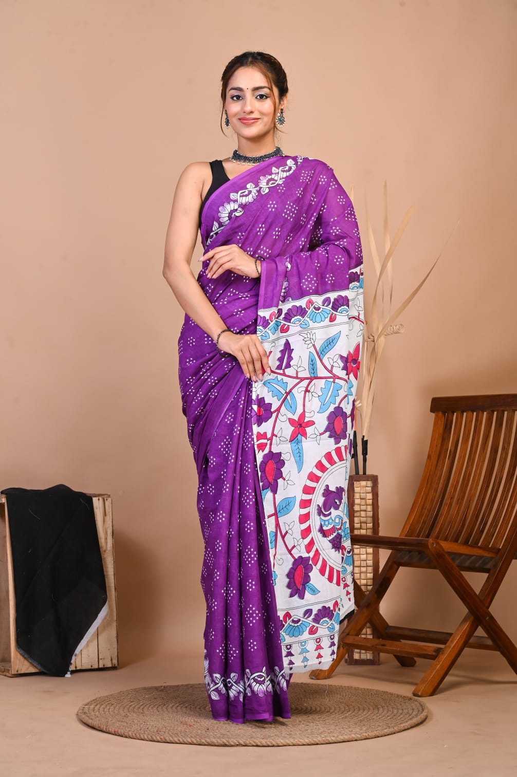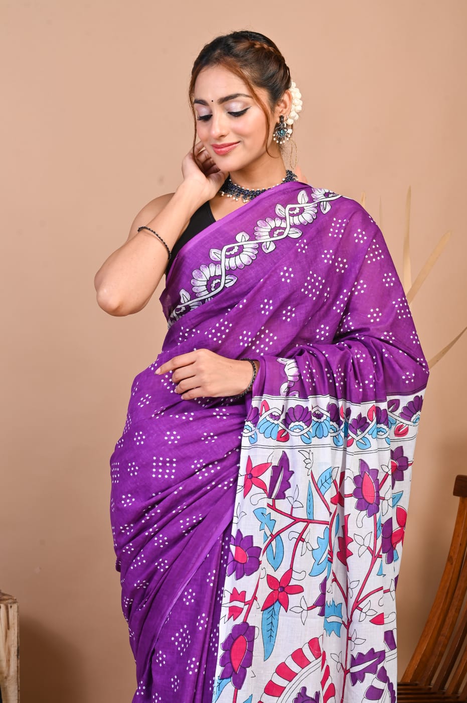 Deepali Purple Color Floral Block Printed Cotton Mulmul Mul Saree with Unstitched Blouse Piece