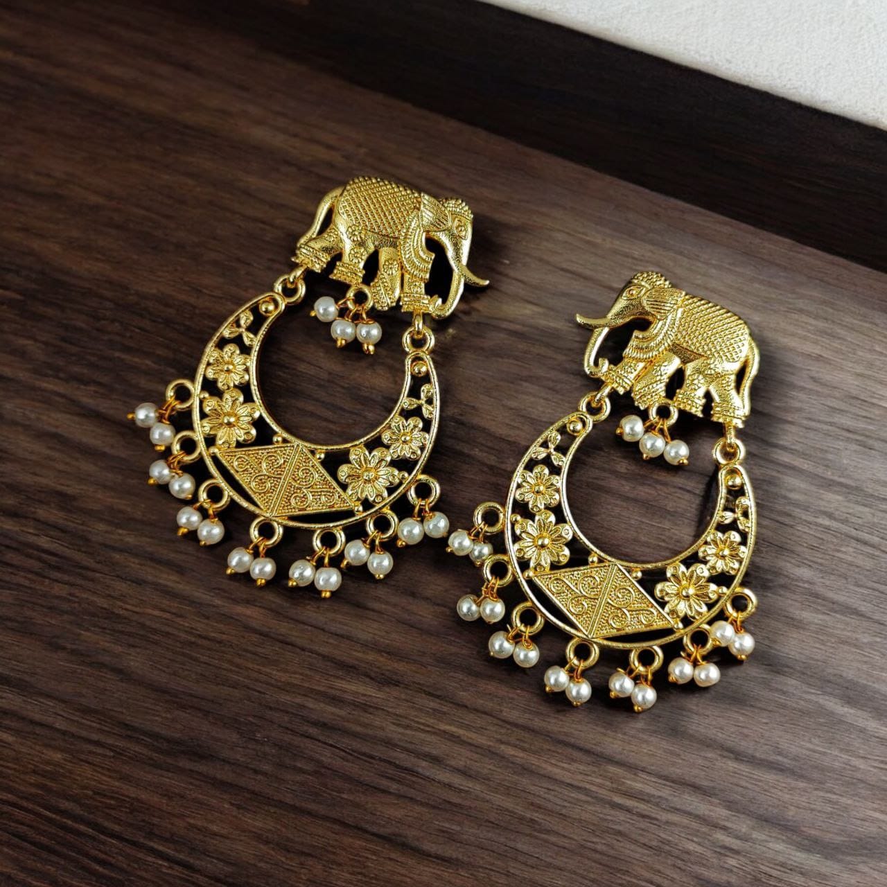 Traditional Indian Elephant Designer Gold Plated Chandbali Ethnic Earrings with Pearl Beads Drop