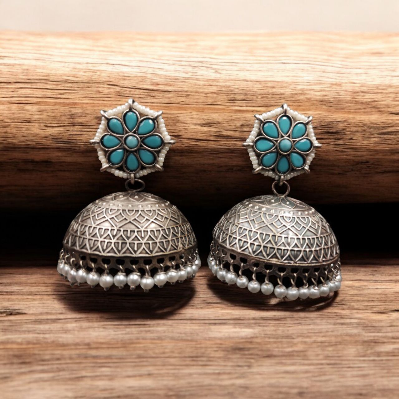 Aqua Bohemian Pakistani Jhumka Earrings Stonework Silver Replica Ethnic Pearl Drops Dangler Earrings for Girls