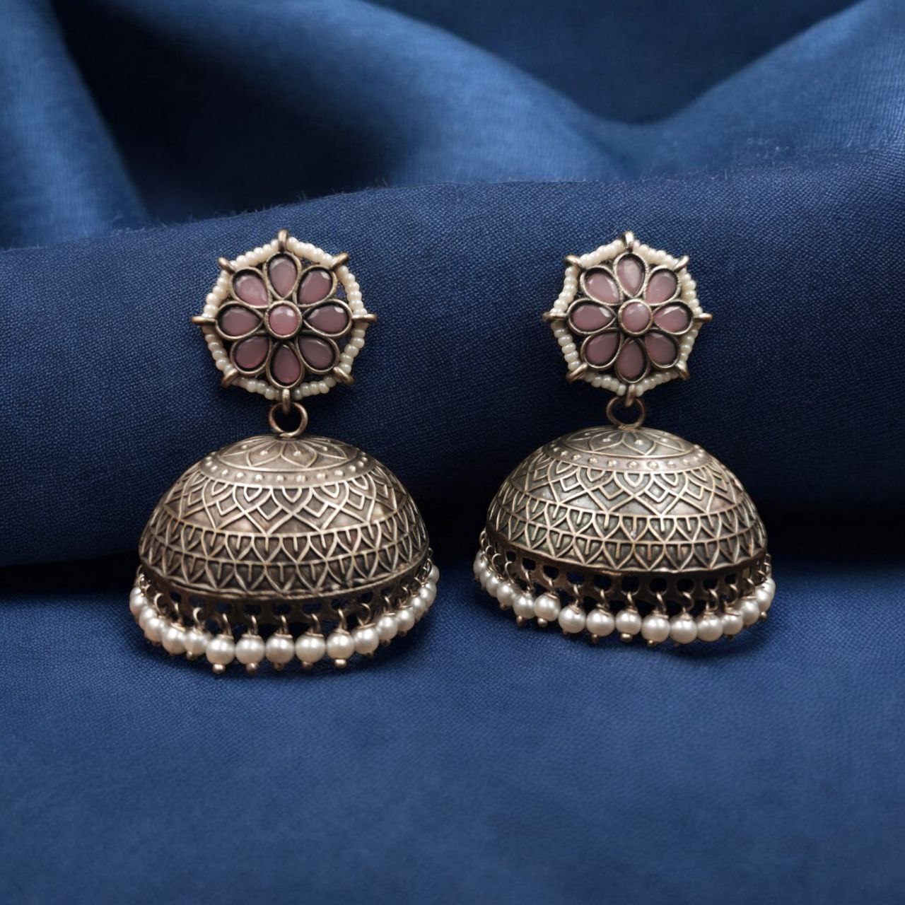 Babypink Bohemian Pakistani Jhumka Earrings Stonework Silver Replica Ethnic Pearl Drops Dangler Earrings for Girls