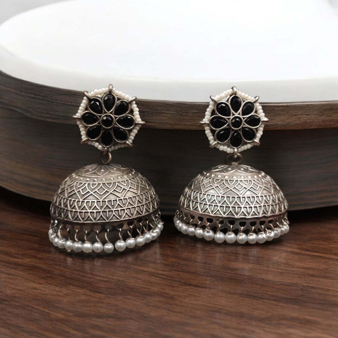 Black Bohemian Pakistani Jhumka Earrings Stonework Silver Replica Ethnic Pearl Drops Dangler Earrings for Girls