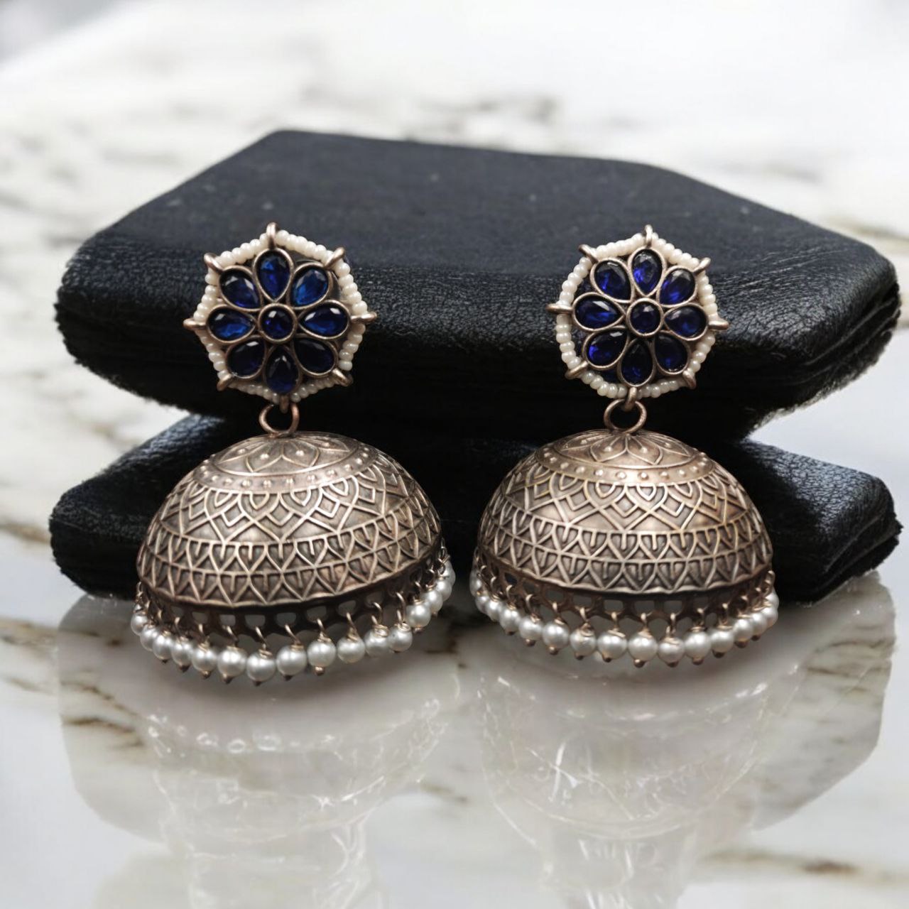 Blue Bohemian Pakistani Jhumka Earrings Stonework Silver Replica Ethnic Pearl Drops Dangler Earrings for Girls