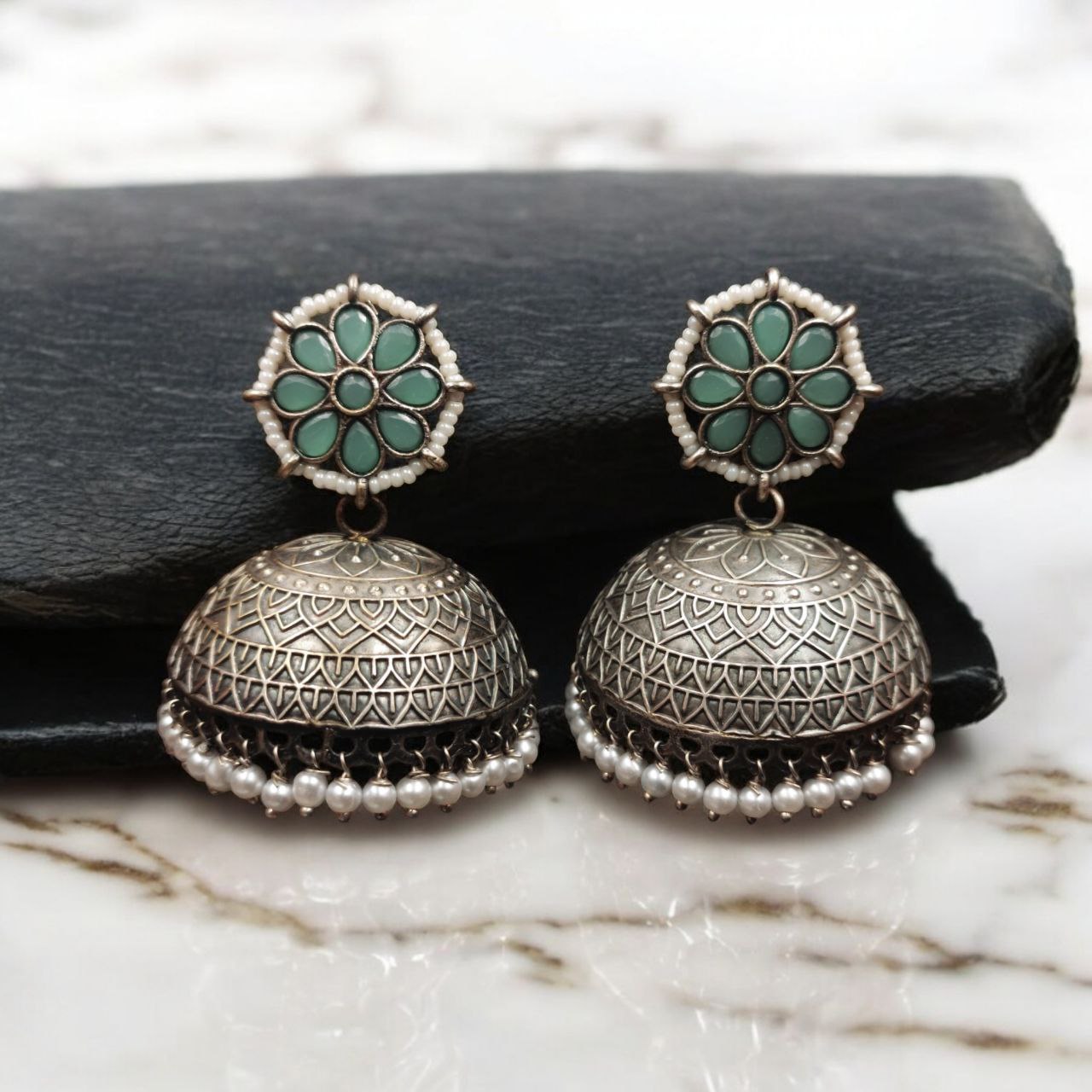 Mint Bohemian Pakistani Jhumka Earrings Stonework Silver Replica Ethnic Pearl Drops Dangler Earrings for Girls