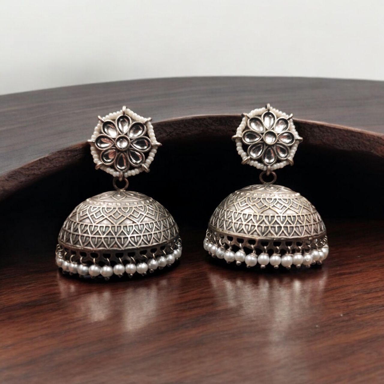 Bohemian Pakistani Jhumka Earrings Stonework Silver Replica Ethnic Pearl Drops Dangler Earrings for Girls