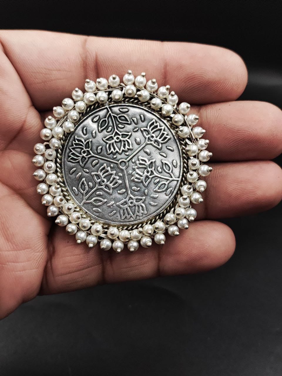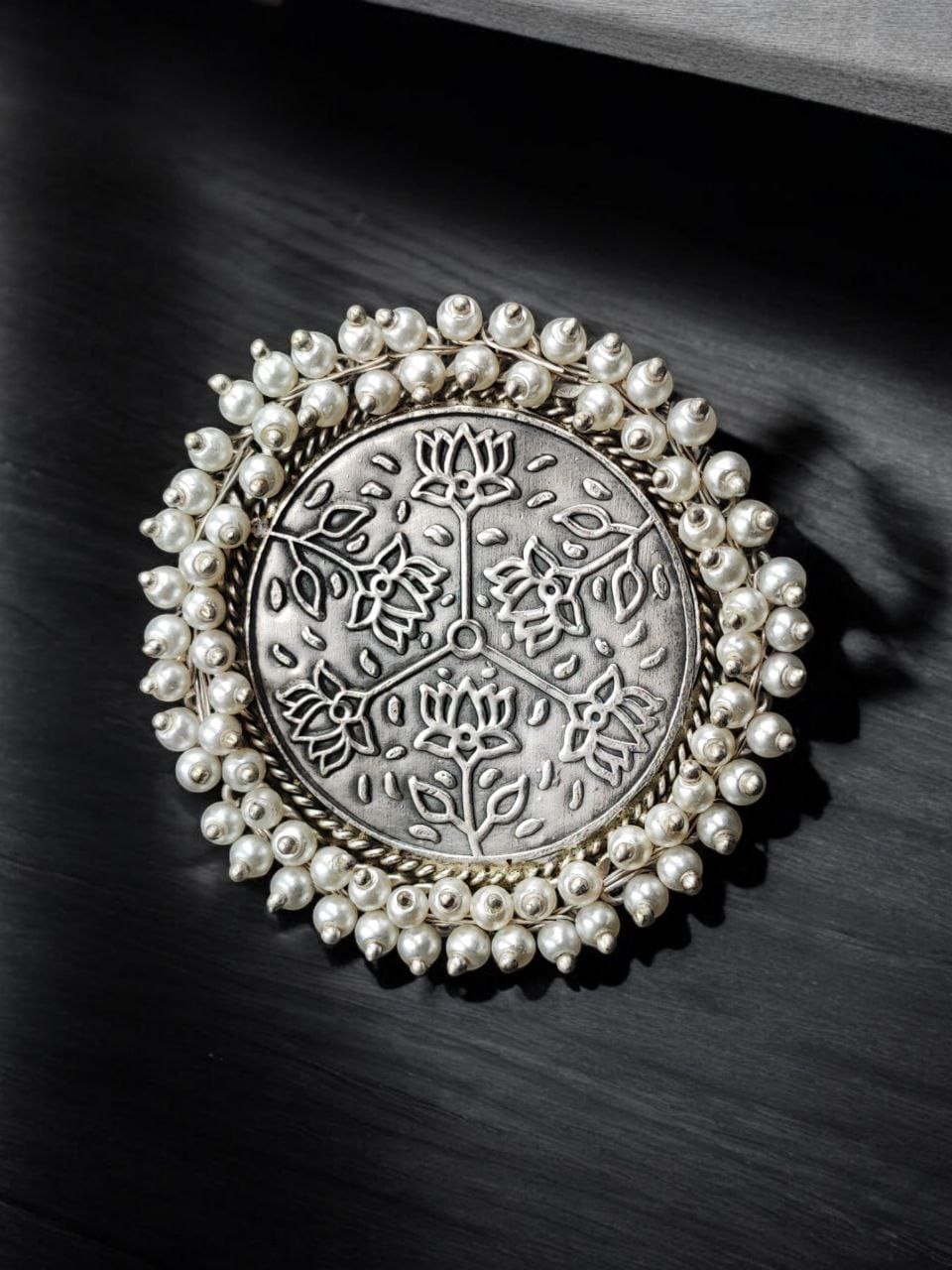 Ethnic Indian Handcrafted Round Pearl Beaded Designer Adjustable Finger Ring Silver Oxidized Brass
