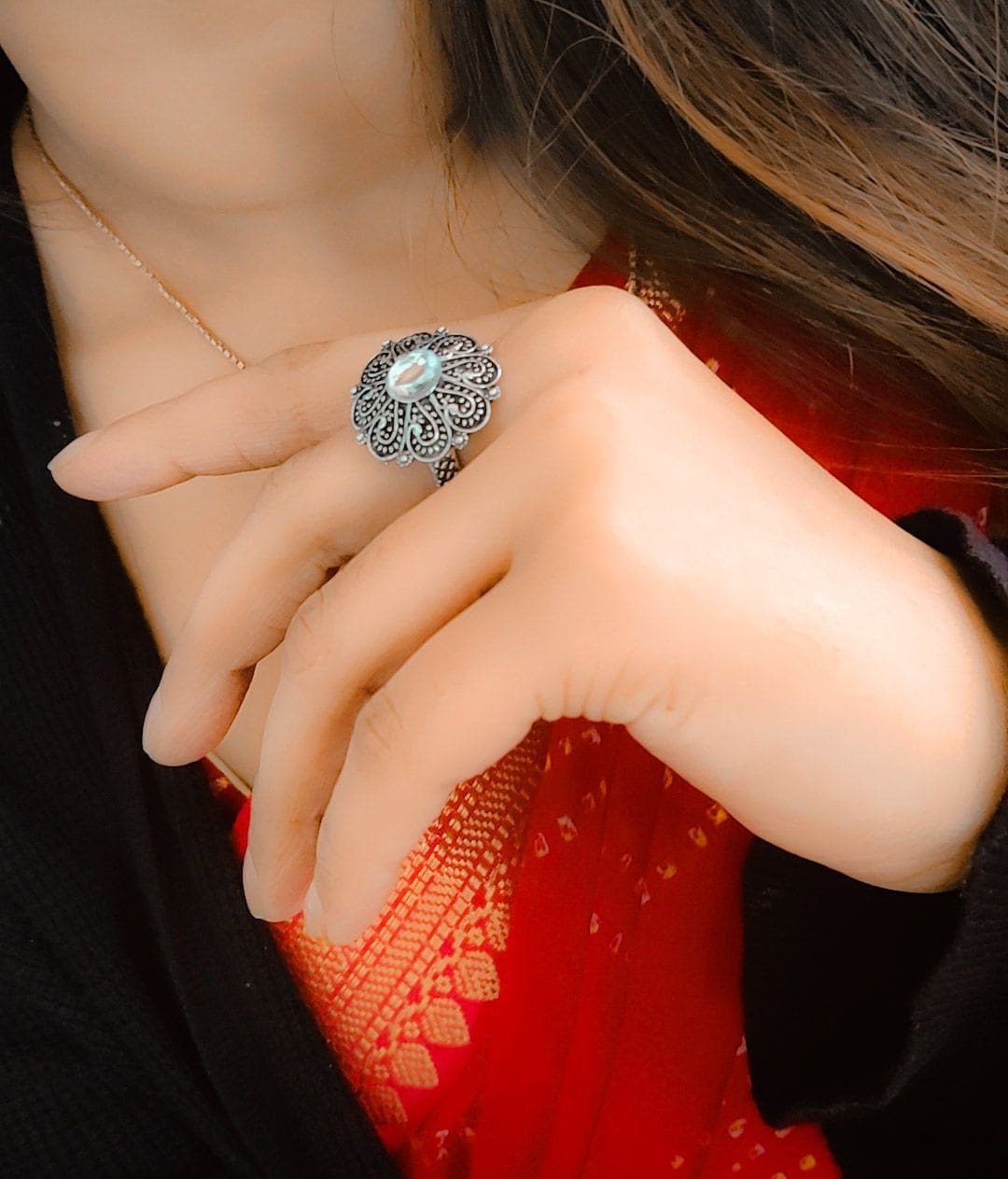 Indian Handcrafted Silver Oxidized Round Stonework Adjustable Free Size Brass Finger Ring for Girls
