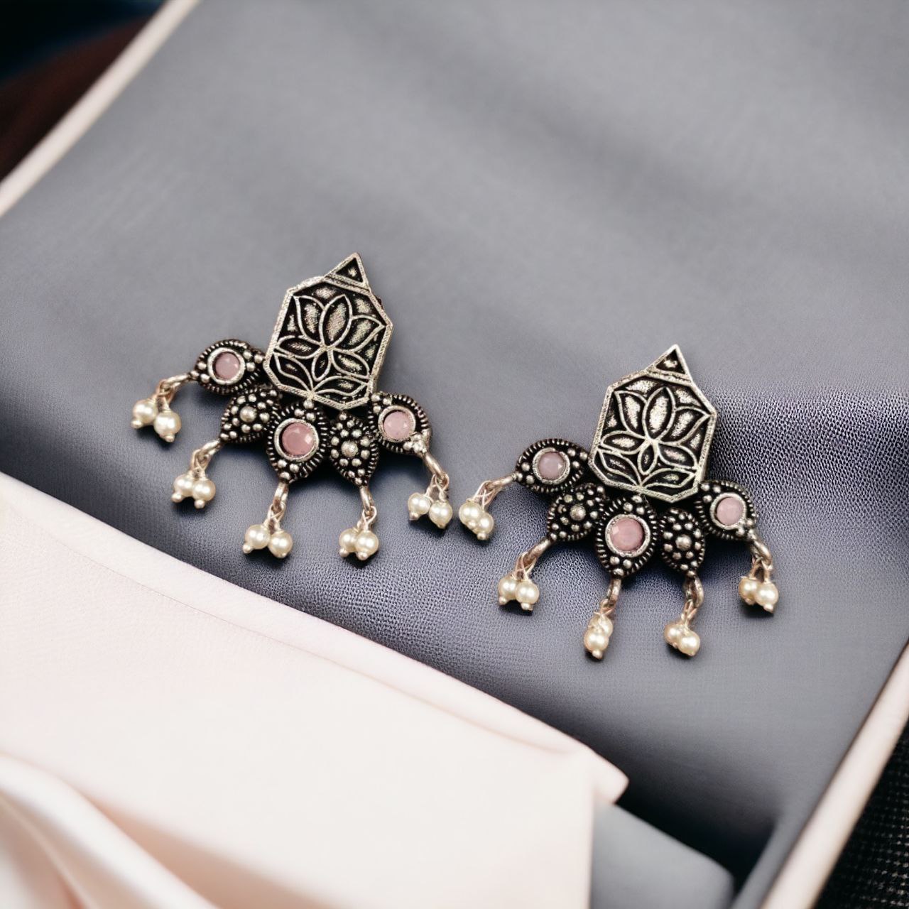Pink Stylish Indian Flower Lutus Designer Rustic Silver Oxidized Earring Stud with Pearl Beads Drop
