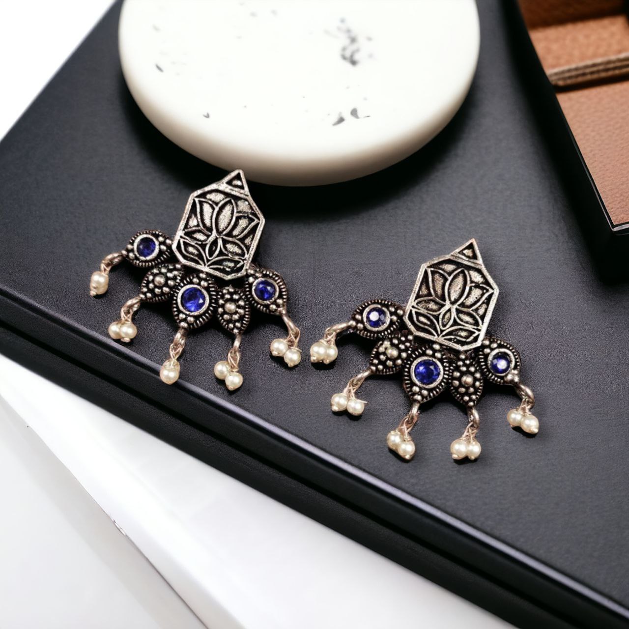 Blue Stylish Indian Flower Lutus Designer Rustic Silver Oxidized Earring Stud with Pearl Beads Drop