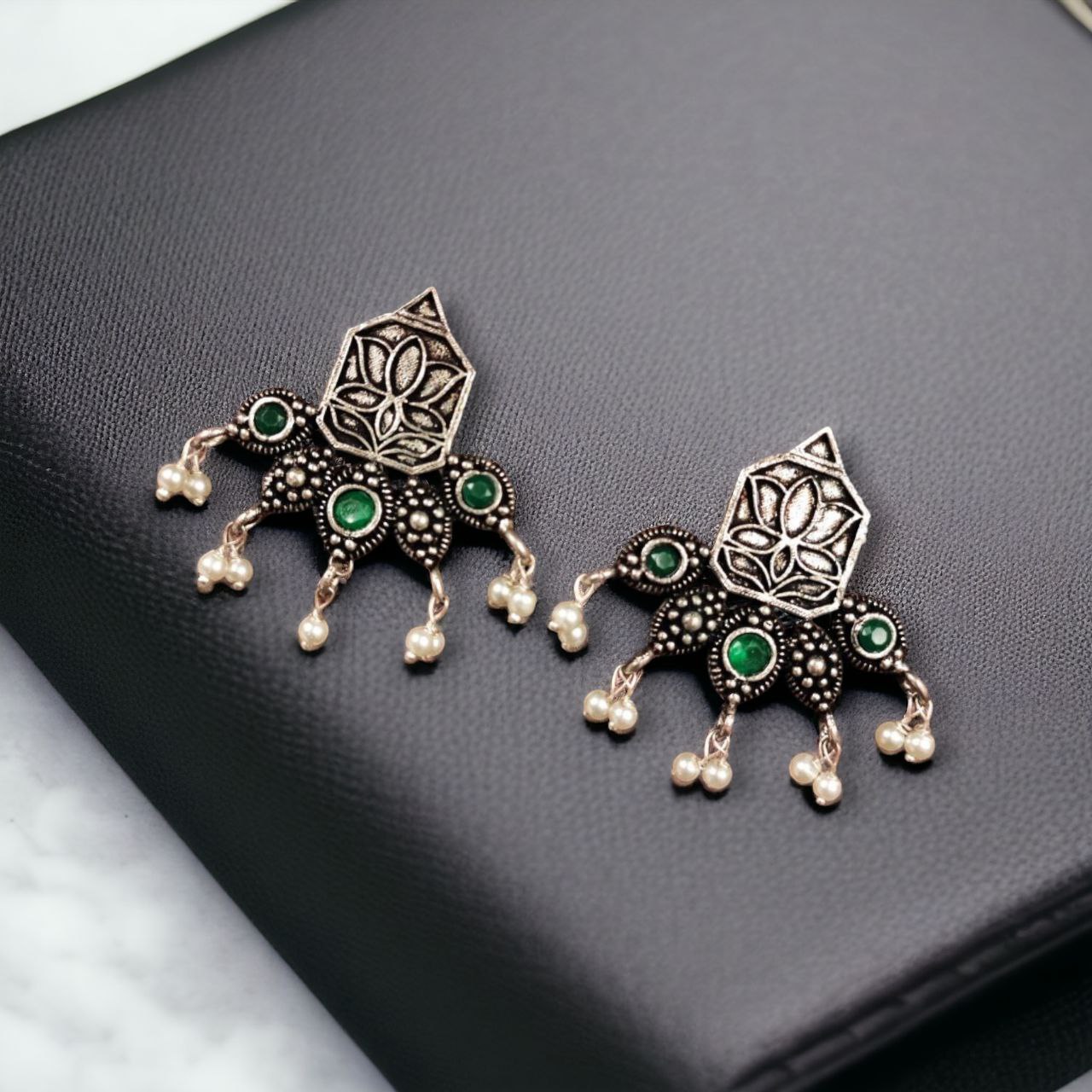 Green Stylish Indian Flower Lutus Designer Rustic Silver Oxidized Earring Stud with Pearl Beads Drop