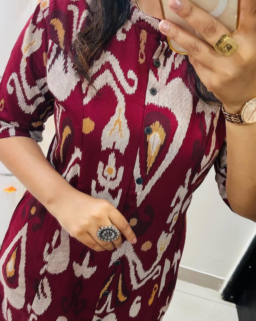 Maroon Ikkat Indian A-Line Printed Cotton Salwar Kameez Kurti Pant Co Ord Set for Women (Set of 2)