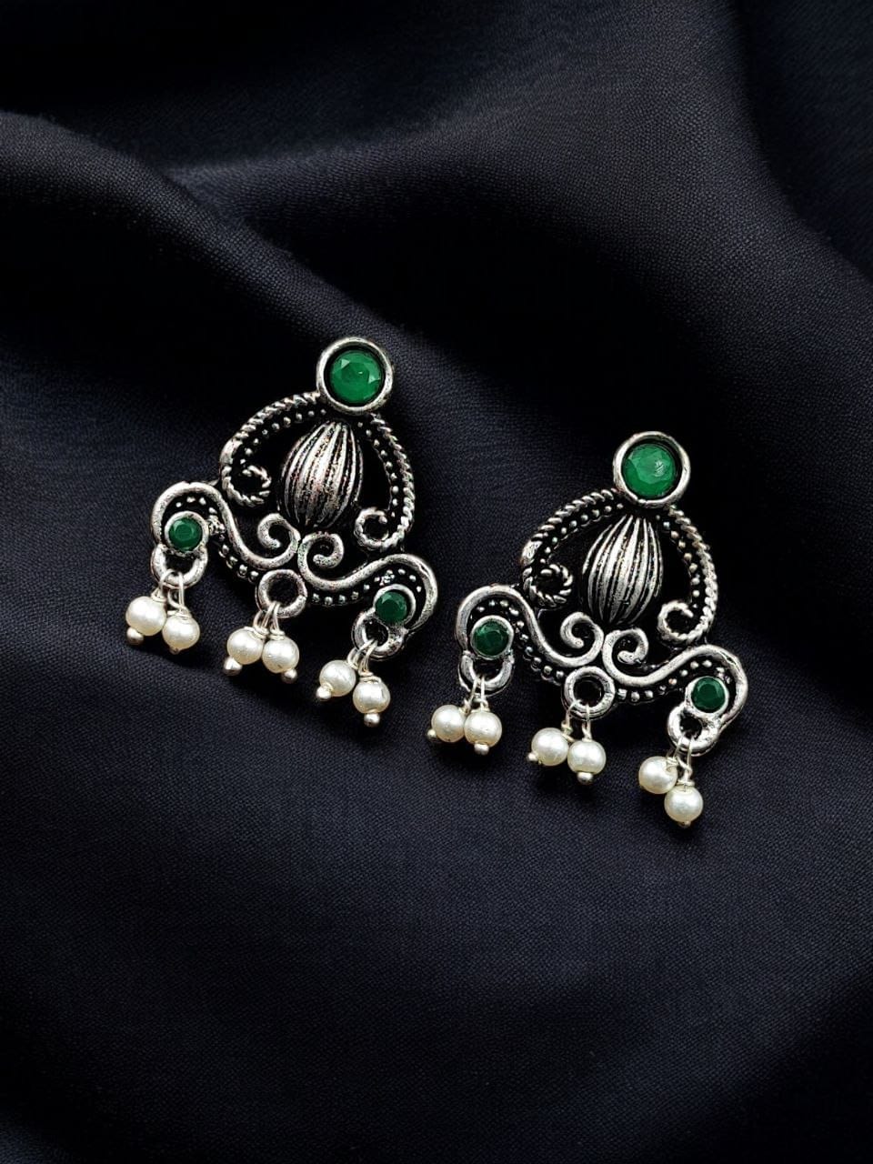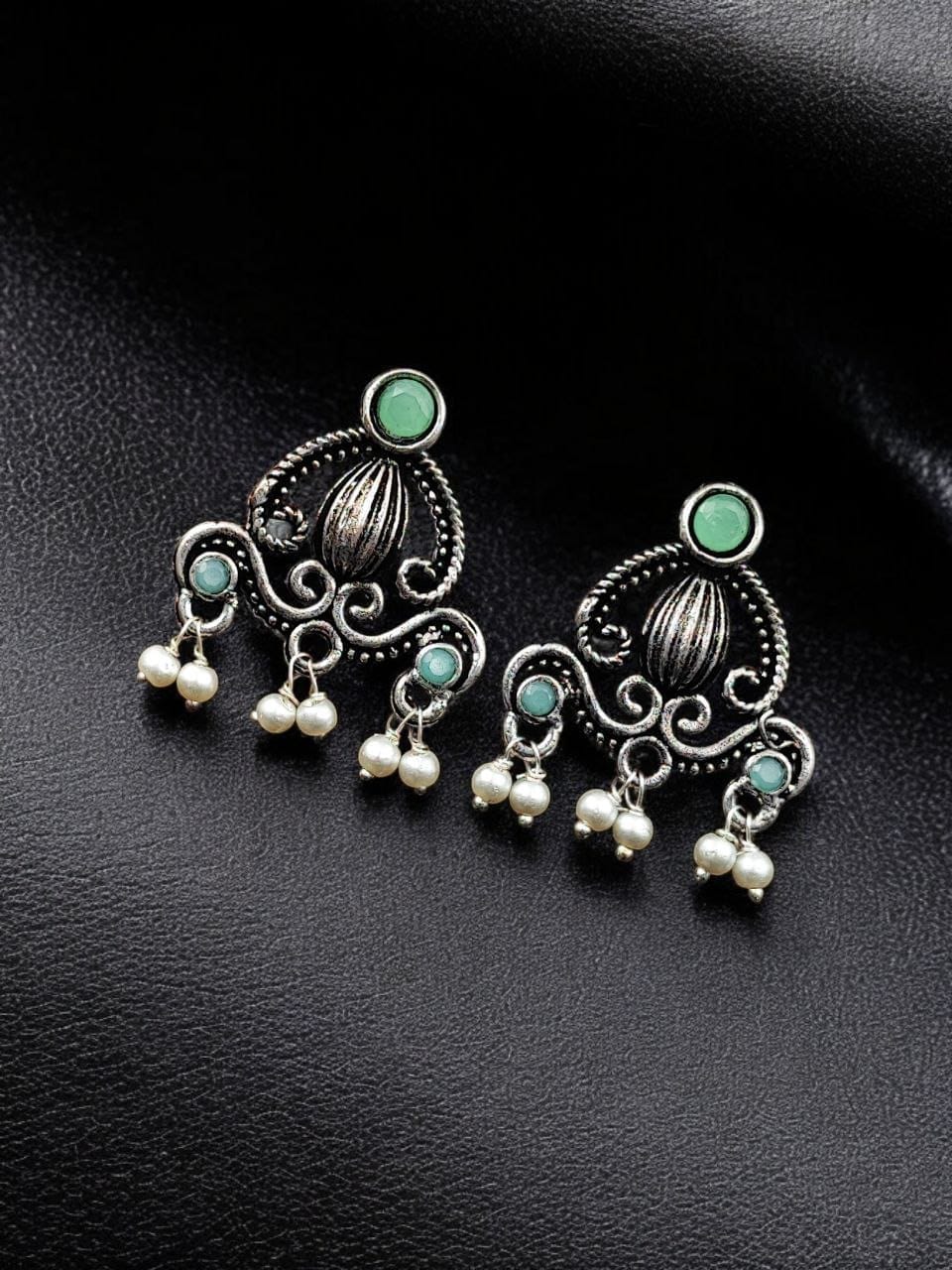 Green Ethnic Indian Silver-toned Oxidized Earring Affordable Stud with Pearl Beads Drop for Women