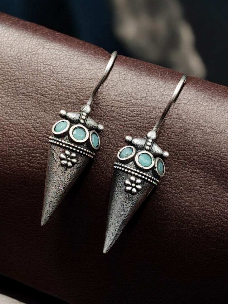 Mint Unique Rustic Vintage Stonework Silver-toned Oxidized Earring Hook Boho Tribal Jewellery for Girls