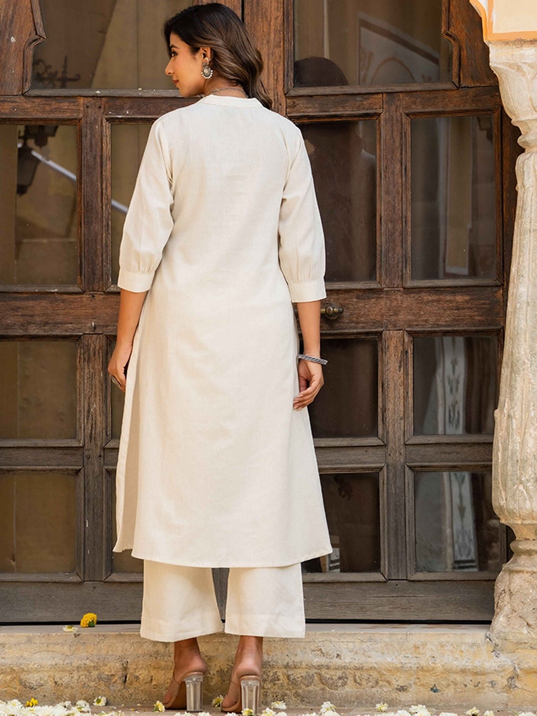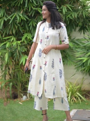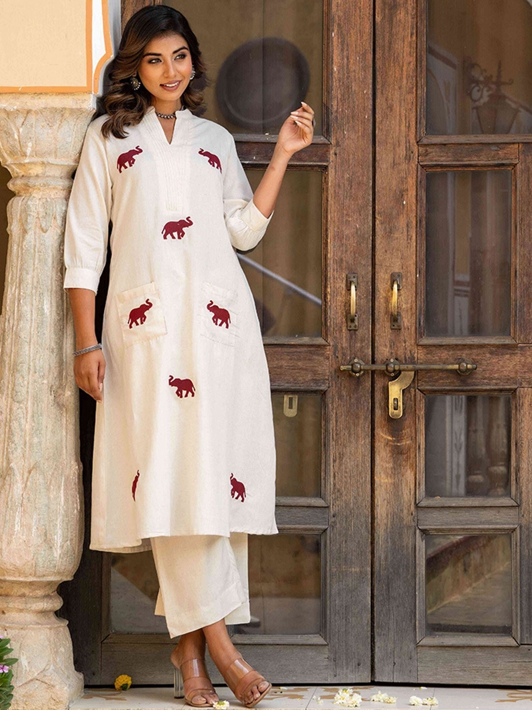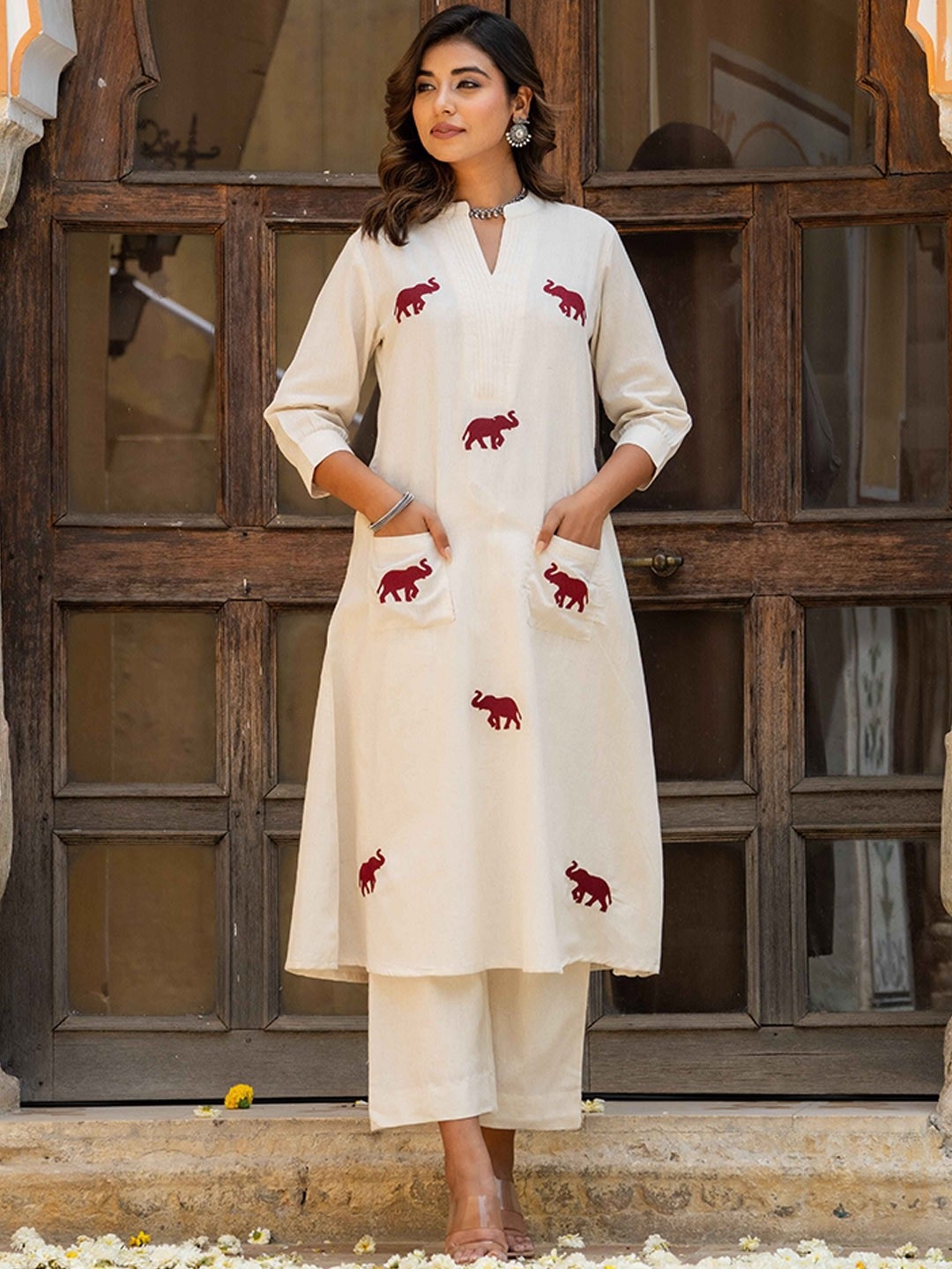 • Black Off White Indian A-Line Elephant Printed Khadi Cotton Kurti Pant Co Ord Set Salwar Kameez - Set Of 2