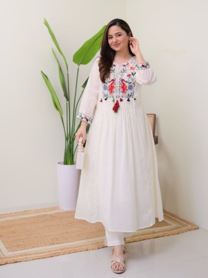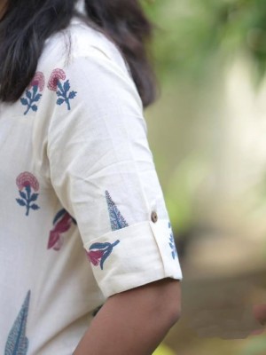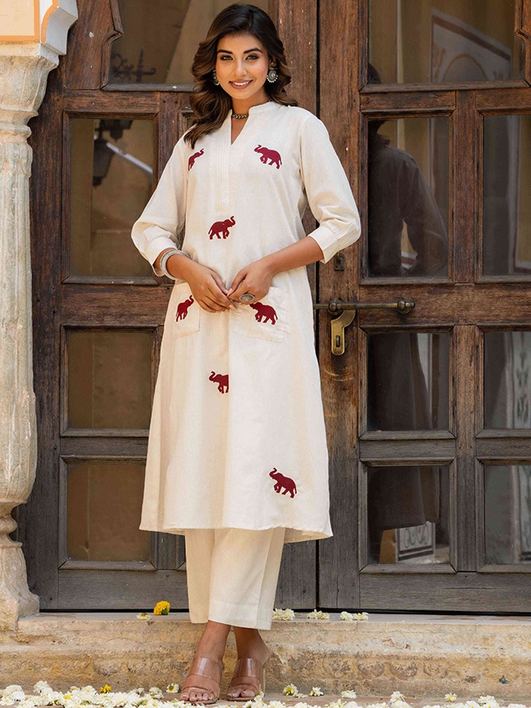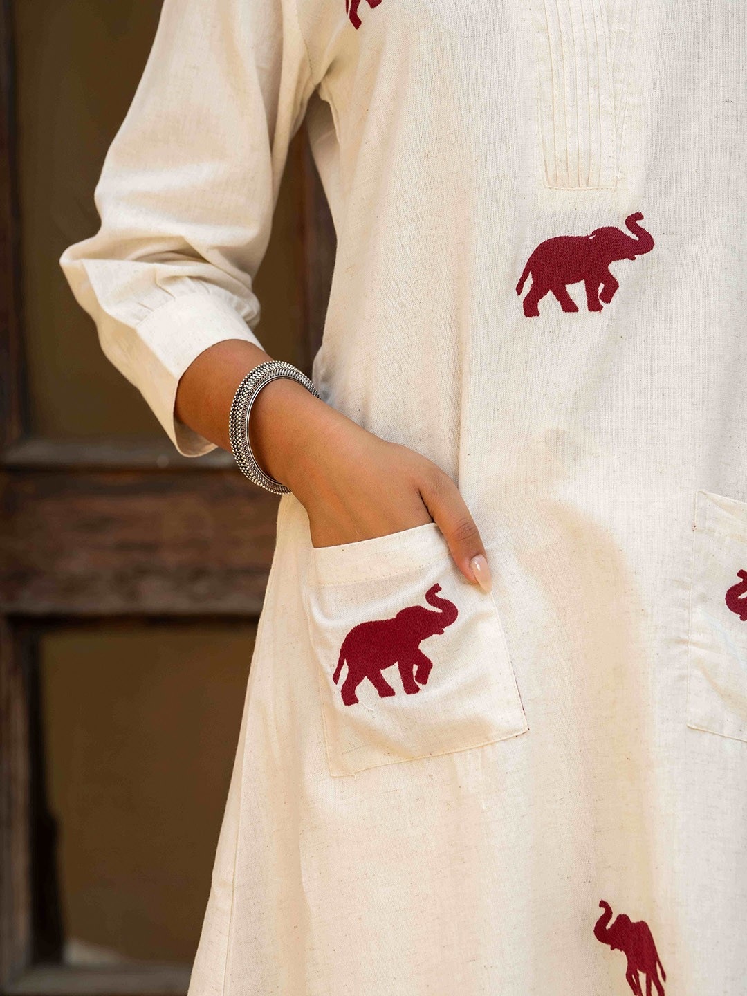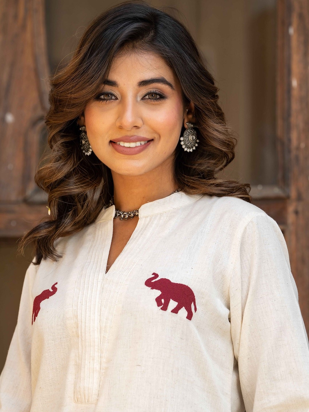 Maroon Off White Indian A-Line Elephant Printed Khadi Cotton Salwar Kameez Kurti Pant Co Ord Set
