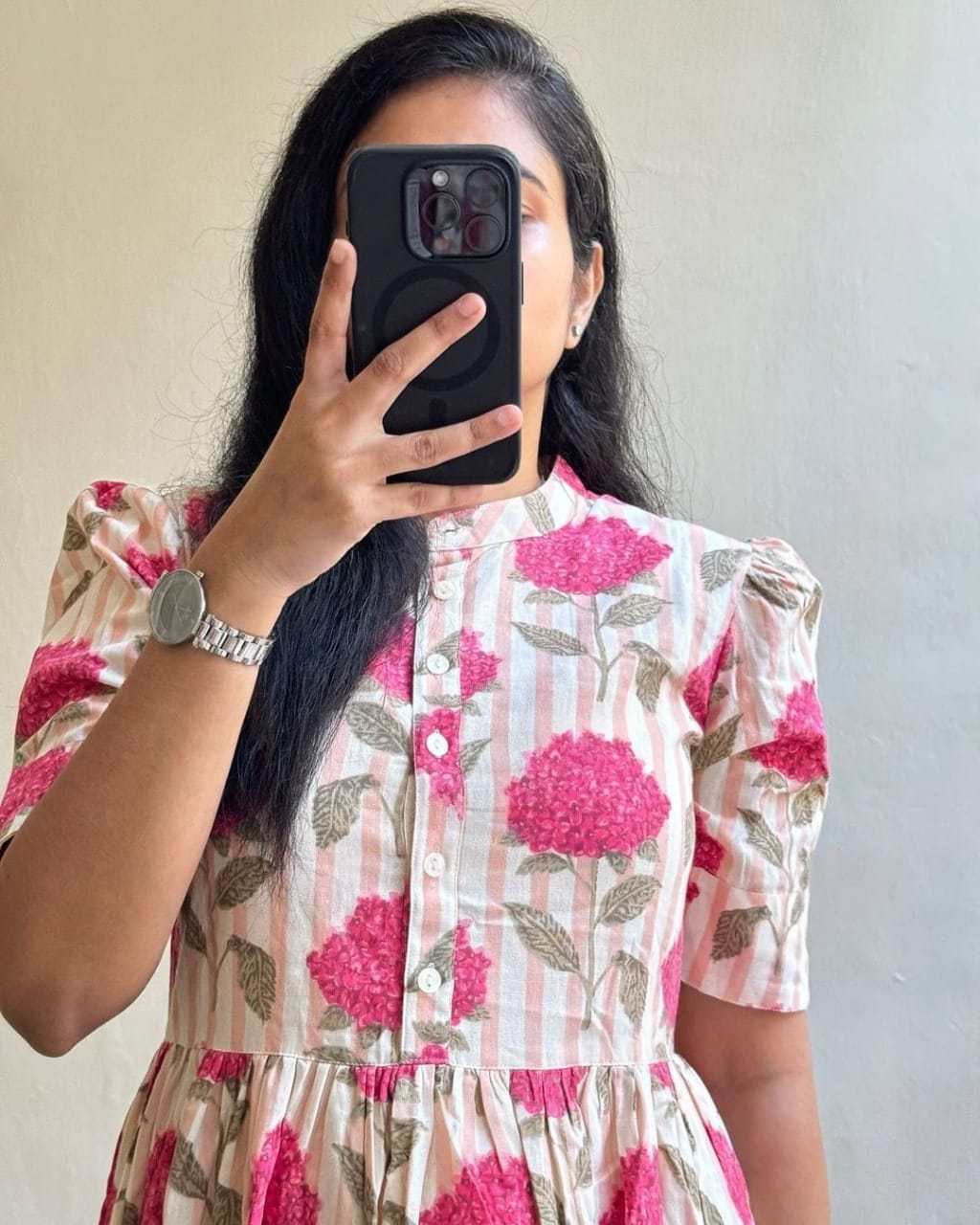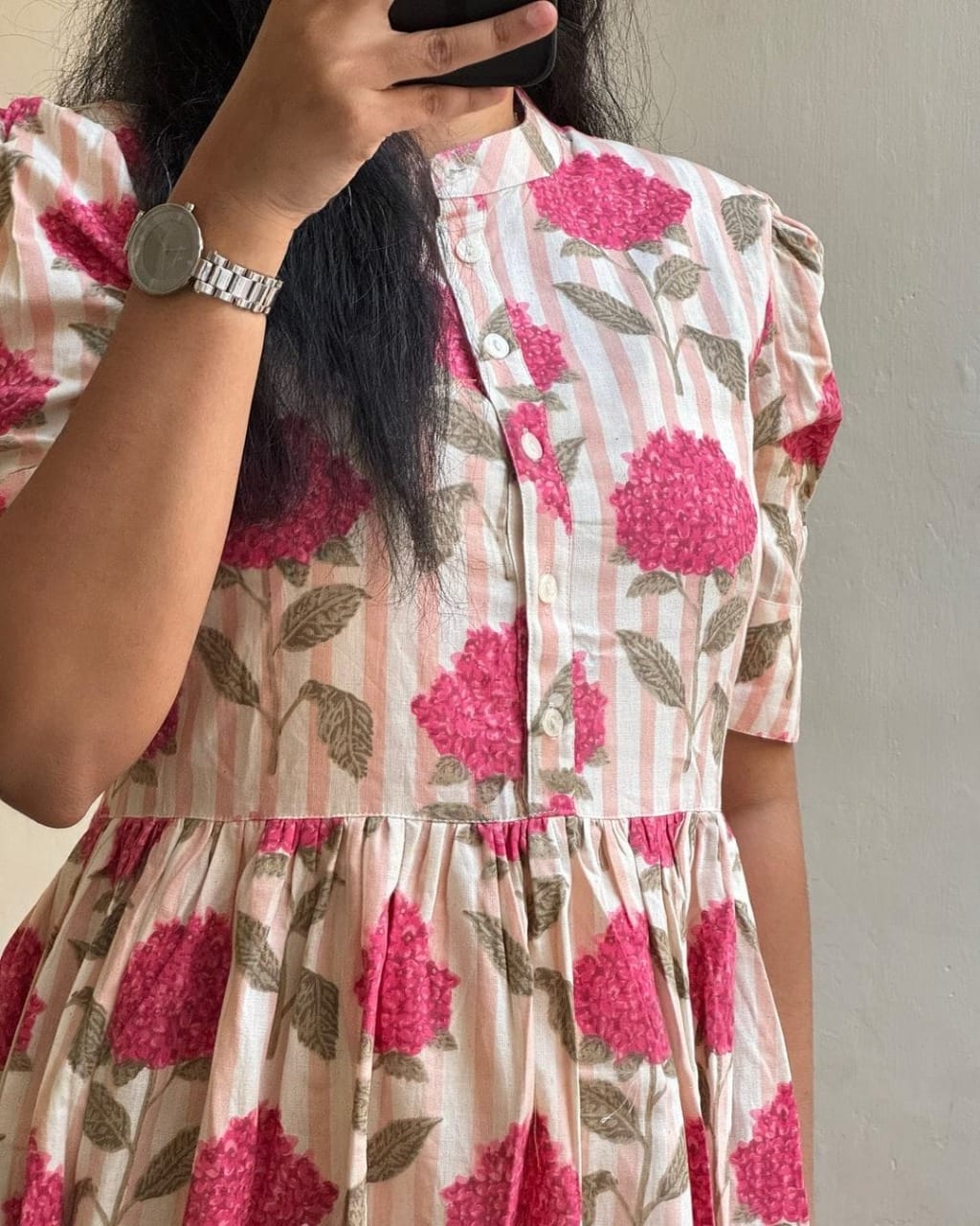 Julia Pink Flower Print Block Printed Flare Kurti Dress Half Sleeves Midi Gown for Women