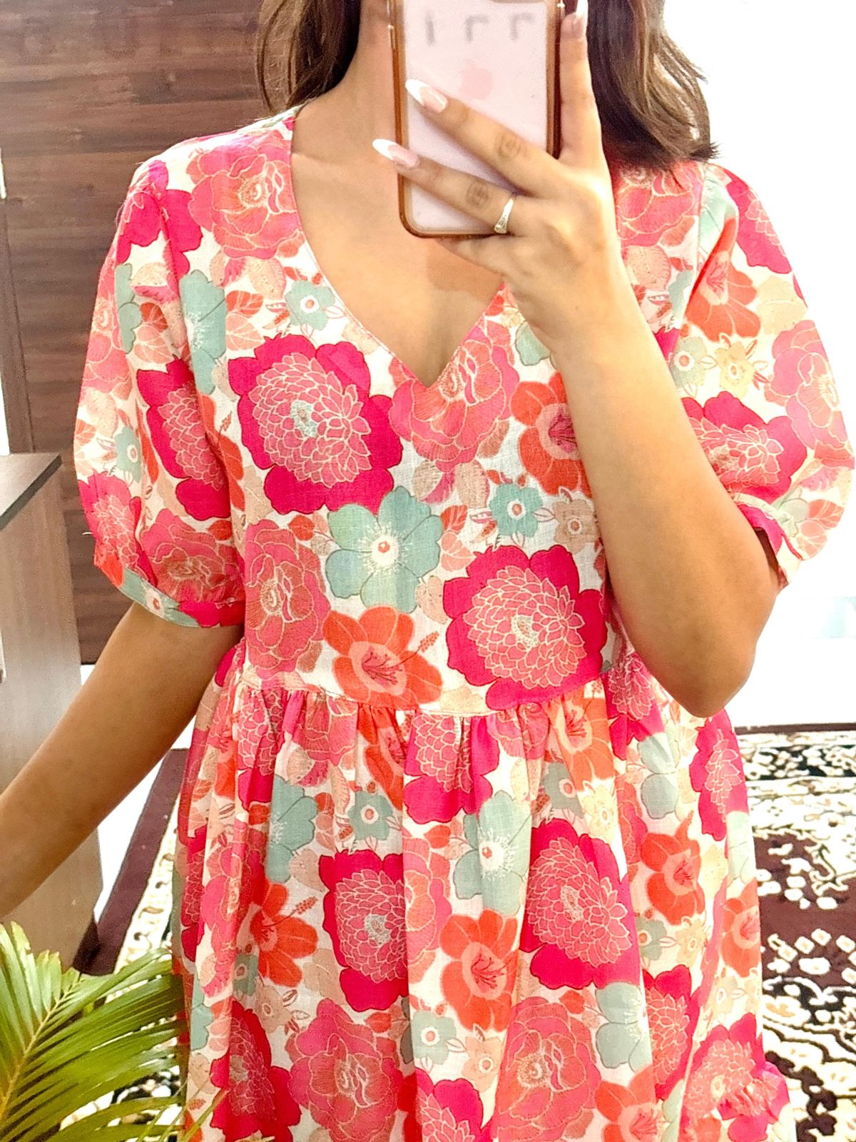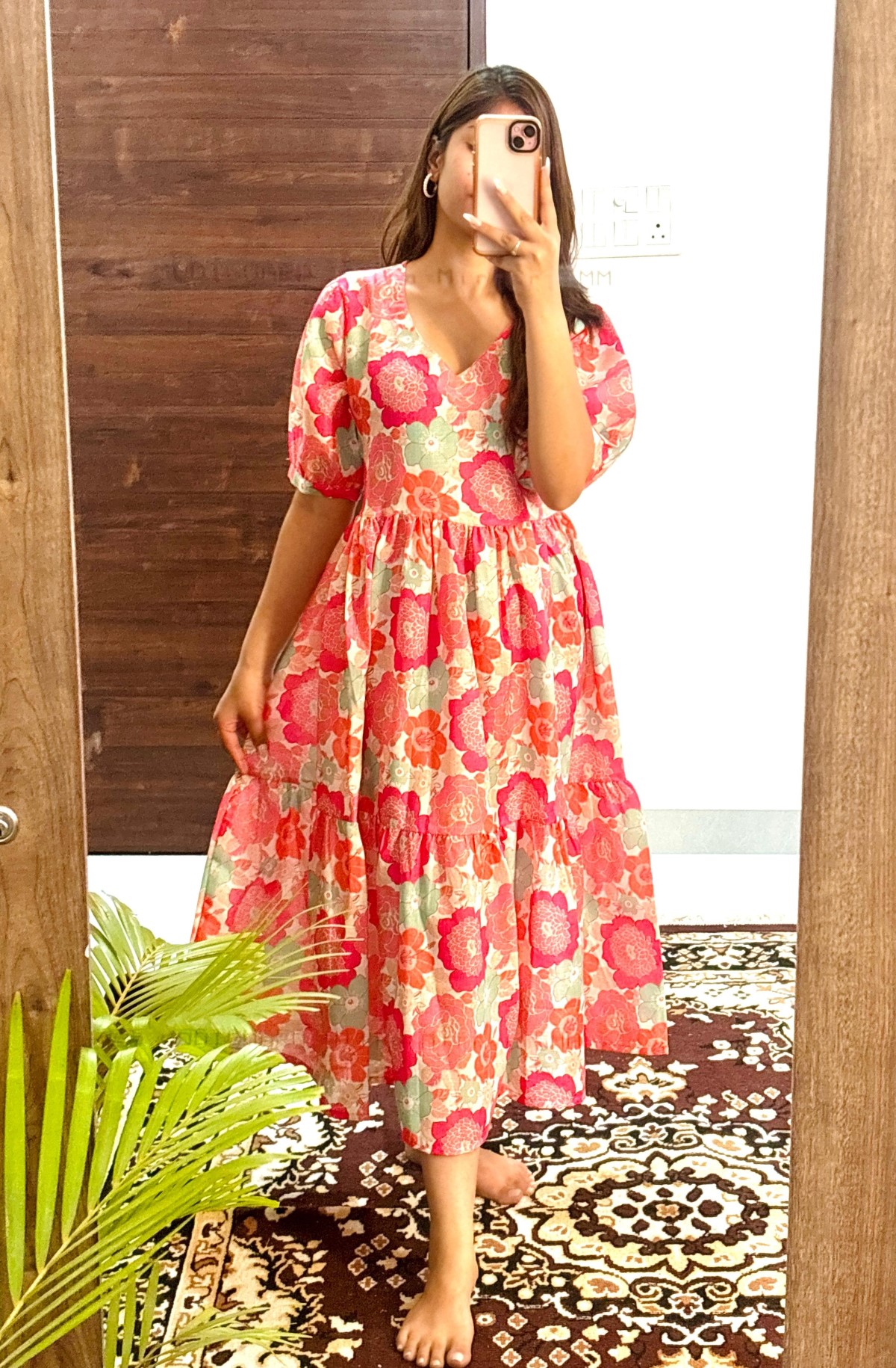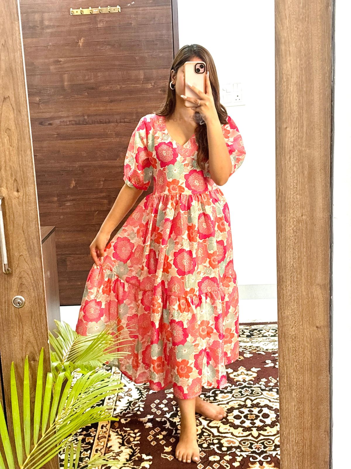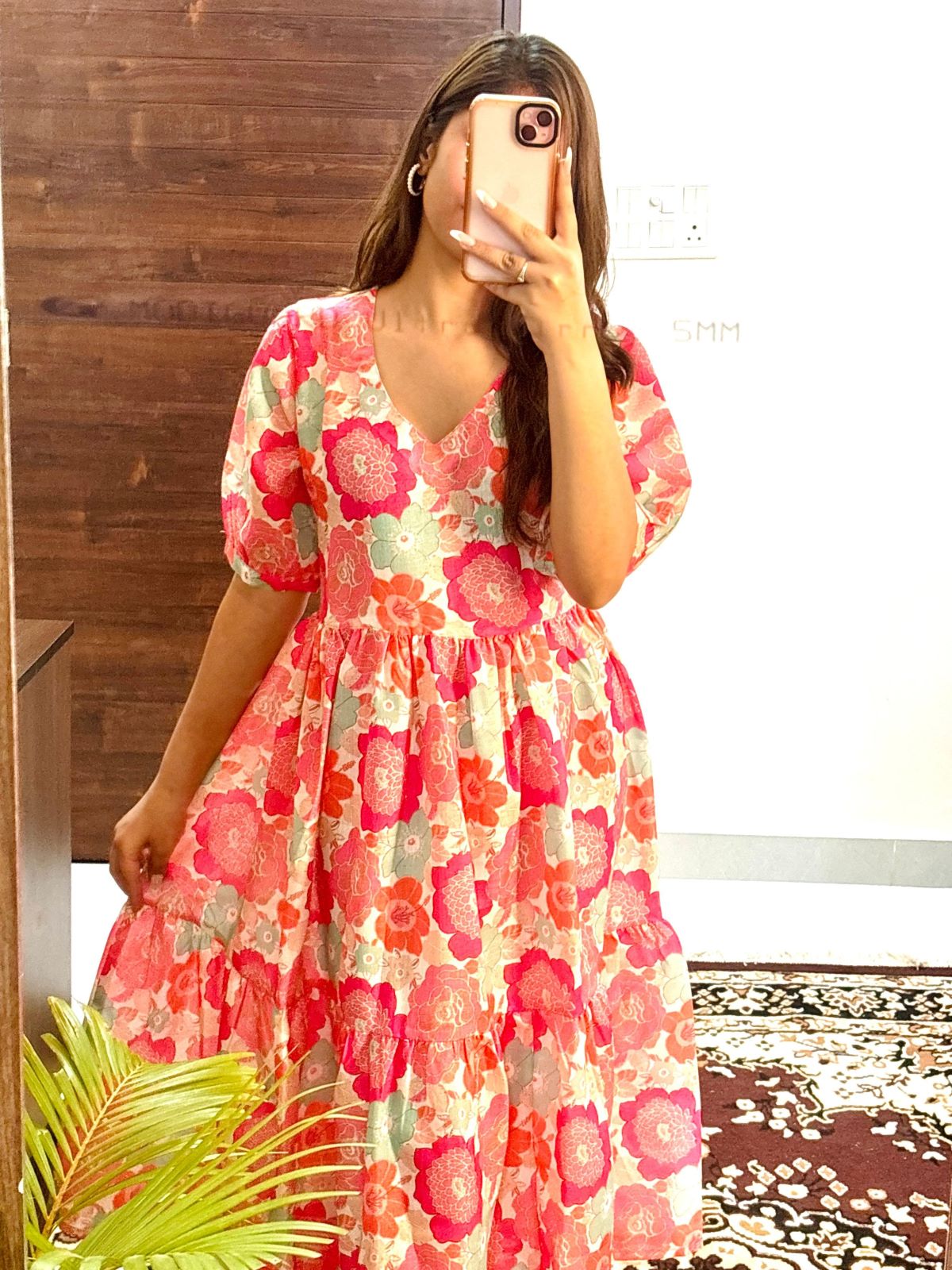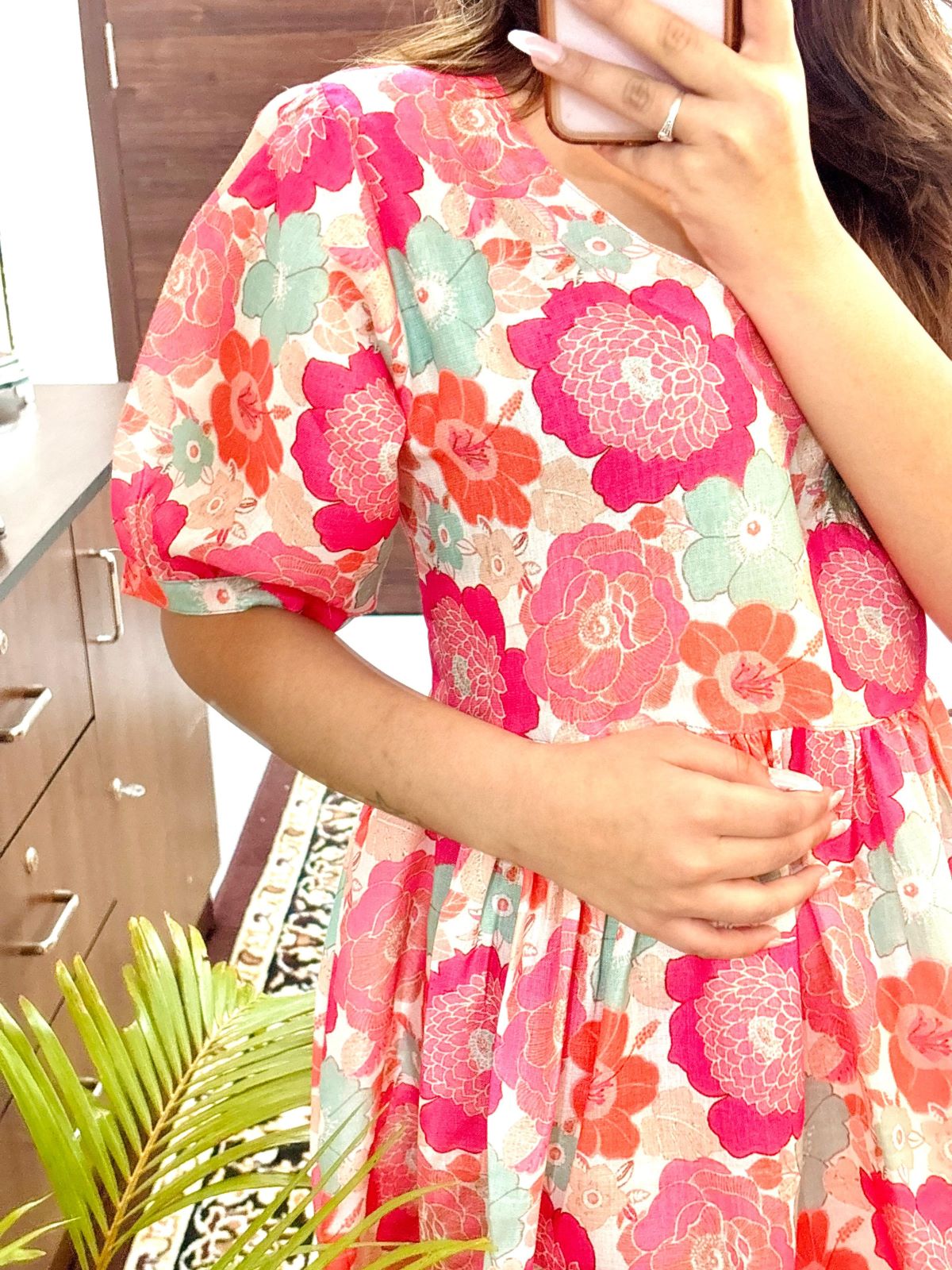 Gracie Pink Flower Printed Flare Kurti Dress Half Sleeves Midi Gown for Women