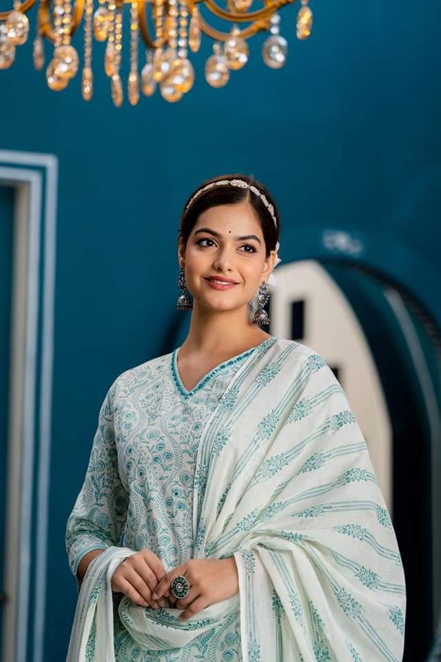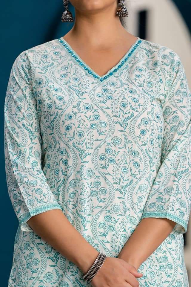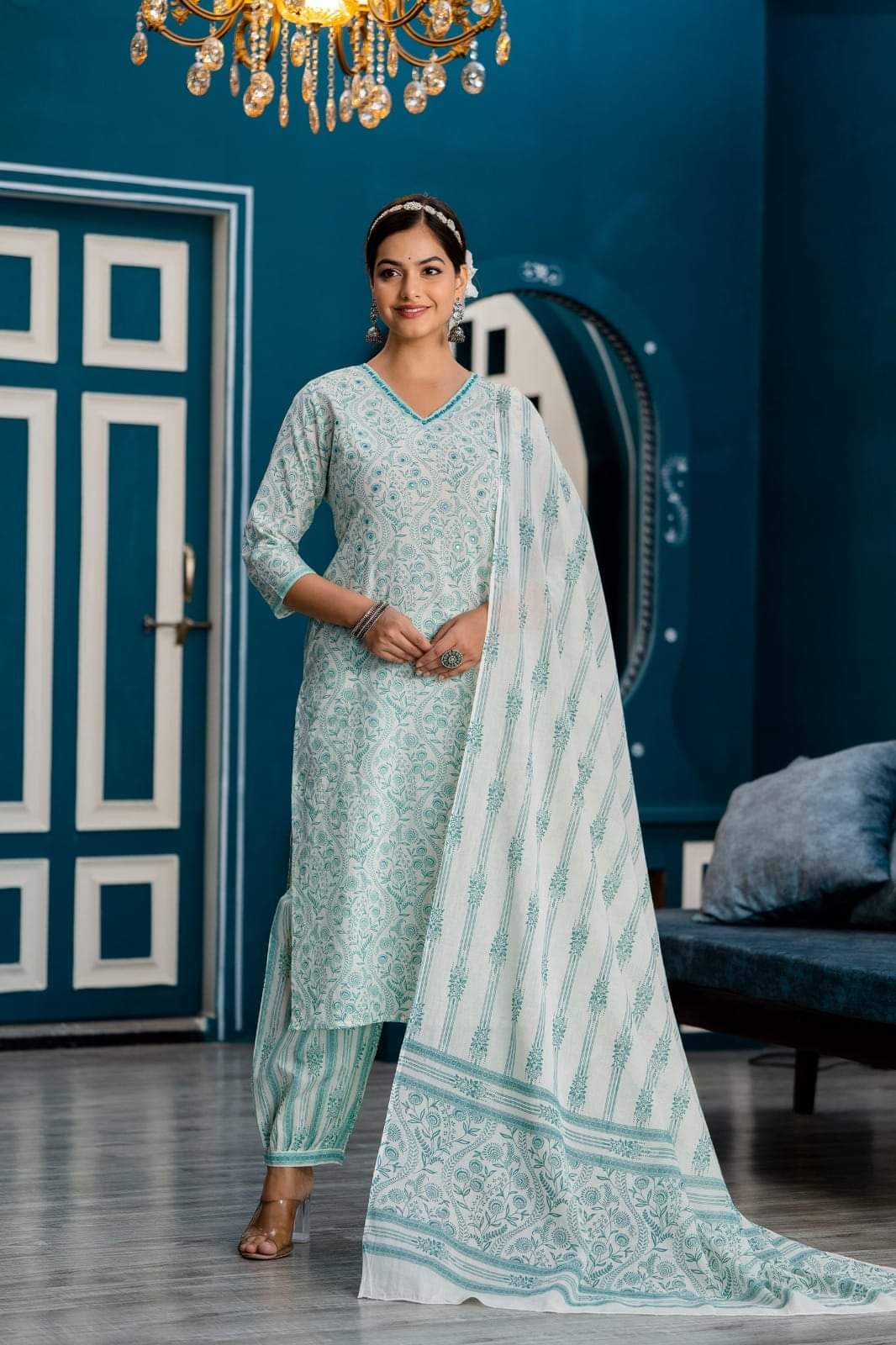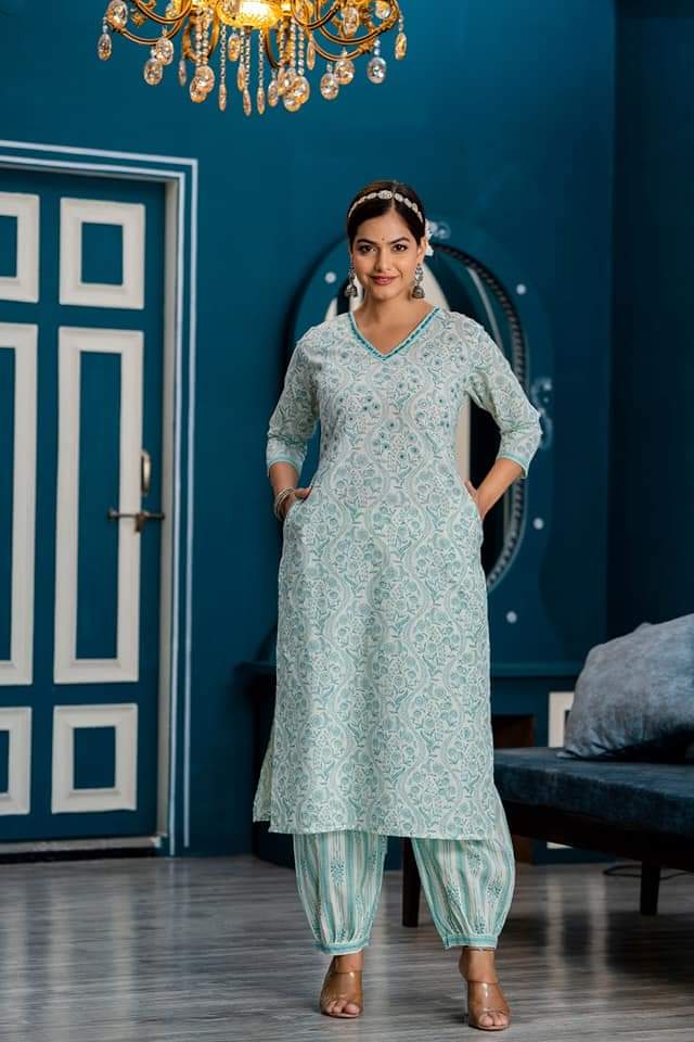 Blue Embroidery And Sequence Work Cotton V-Neck Kurti Afghani Pant Dupatta Set Salwar Kameez