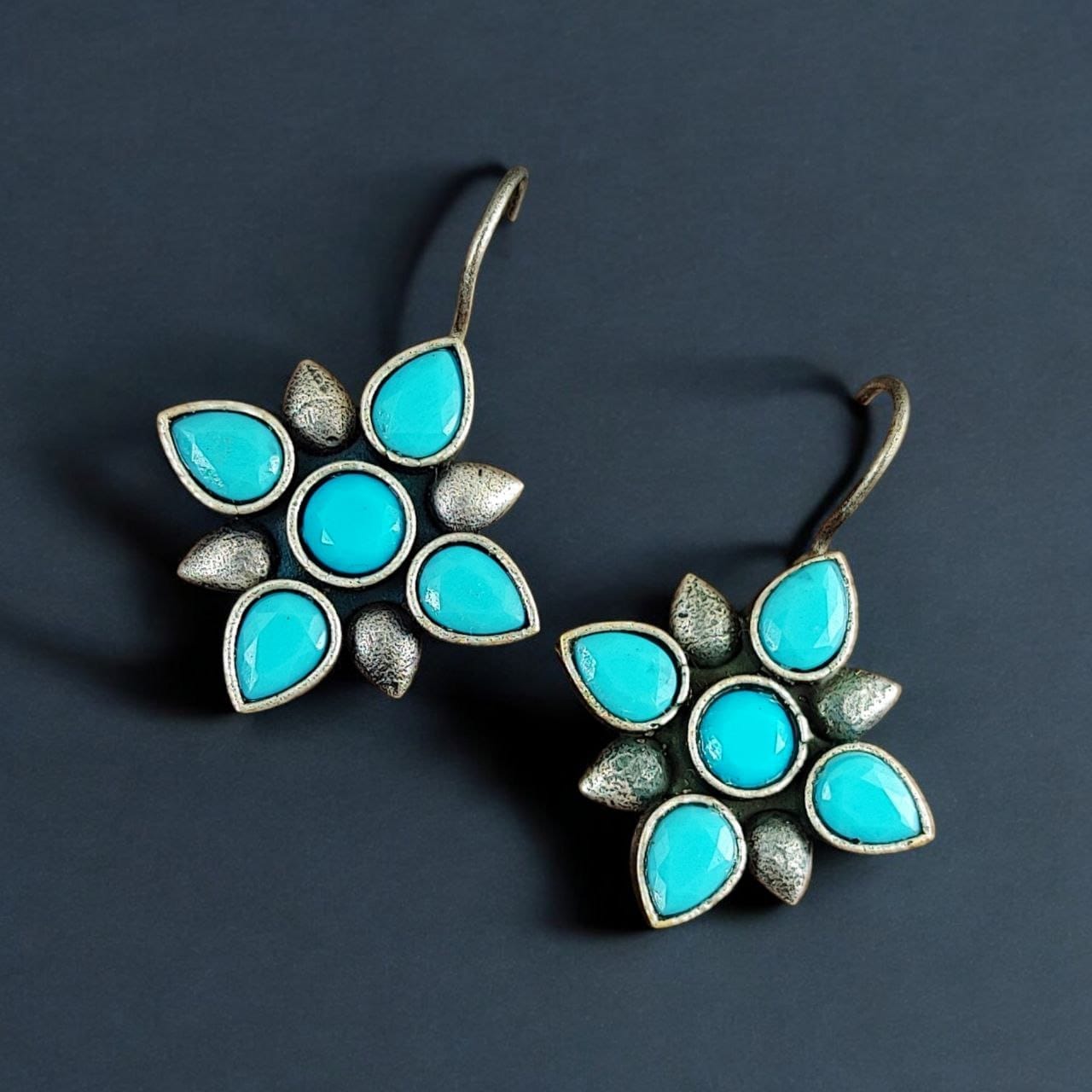 Blue Beautiful Silver-toned Oxidized Earring Hook Drop Ethnic Indian Stonework Earrings for Women