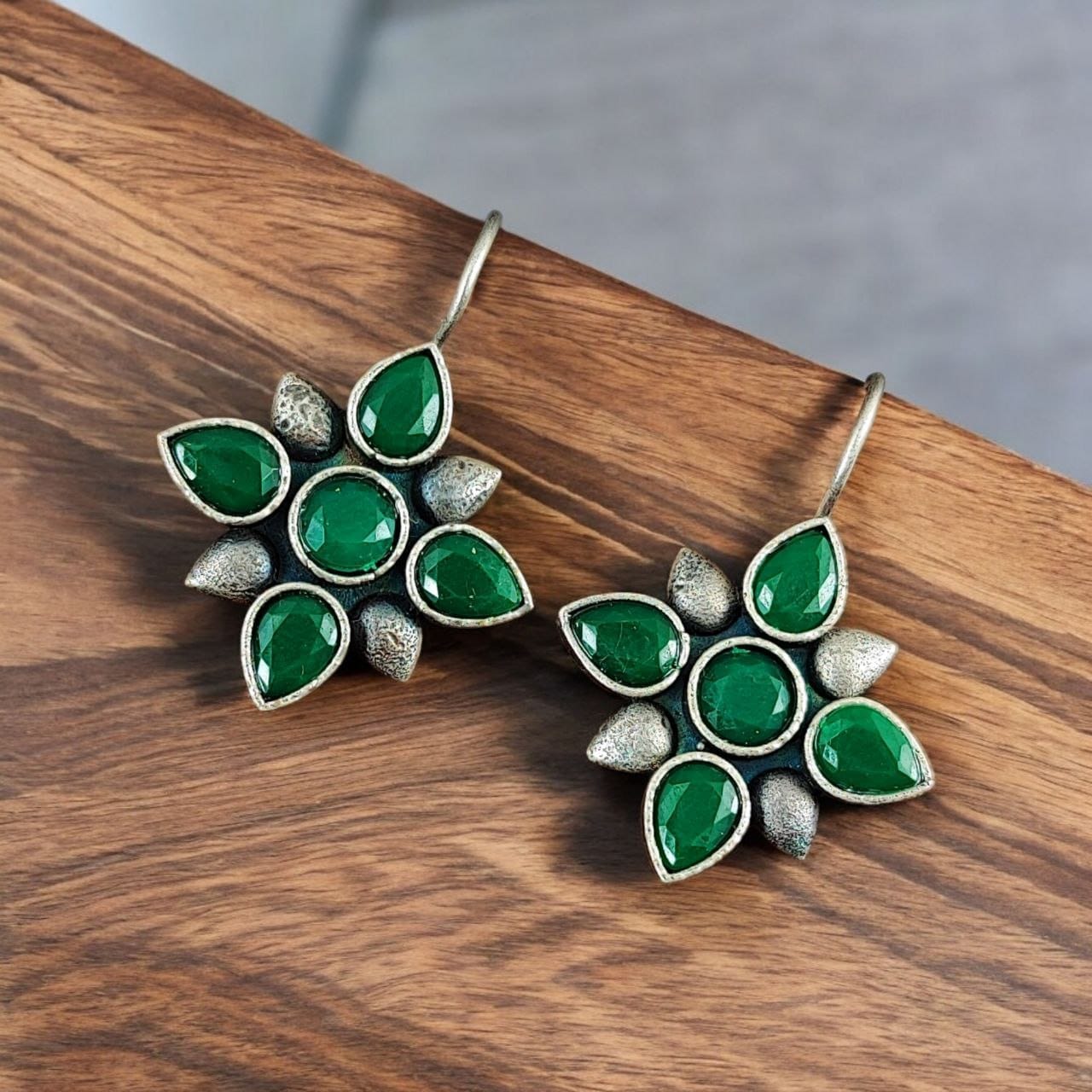 Green Beautiful Silver-toned Oxidized Earring Hook Drop Ethnic Indian Stonework Earrings for Women