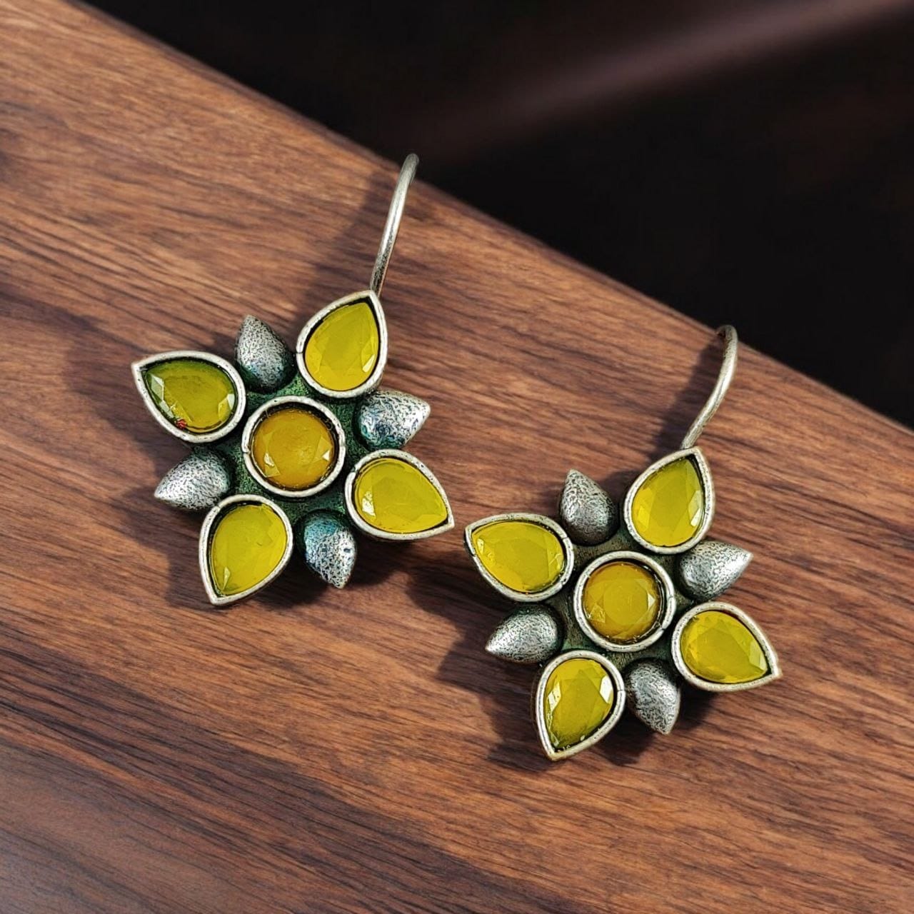 Yellow Beautiful Silver-toned Oxidized Earring Hook Drop Ethnic Indian Stonework Earrings for Women
