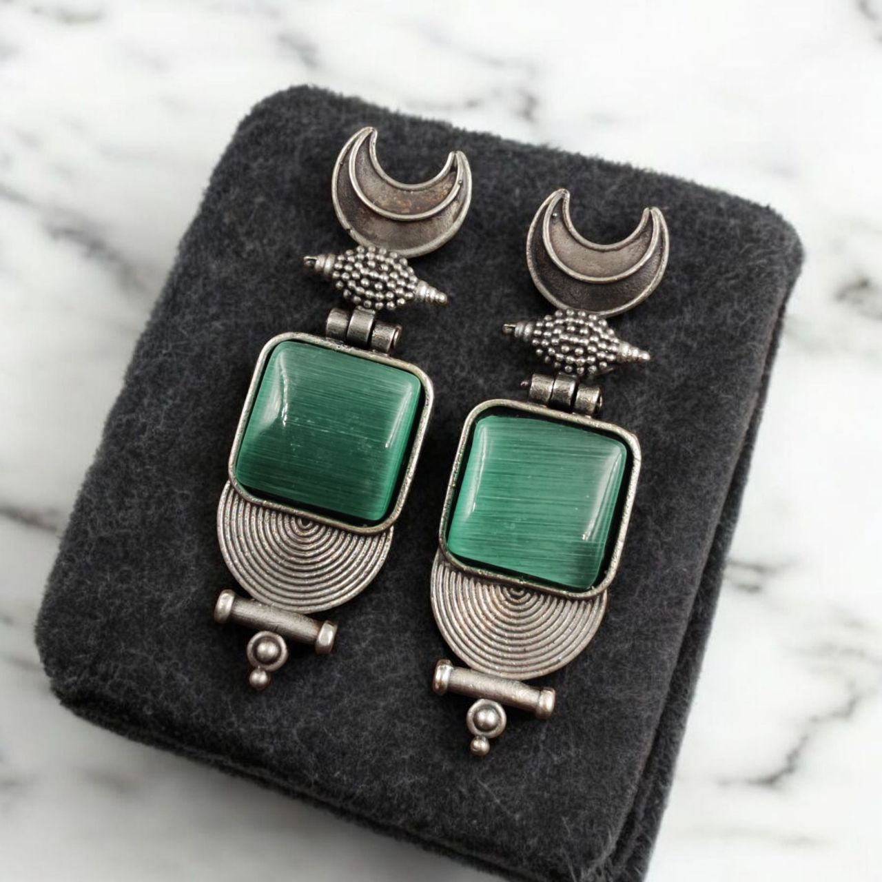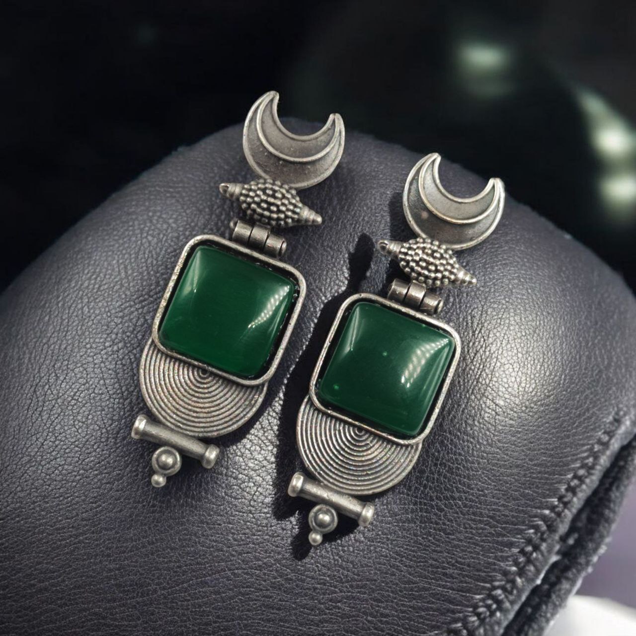 Green Stunning Crescent Moon Designer Silver Oxidized Earring Drop Dangler Monalisa Stone Earrings for Women