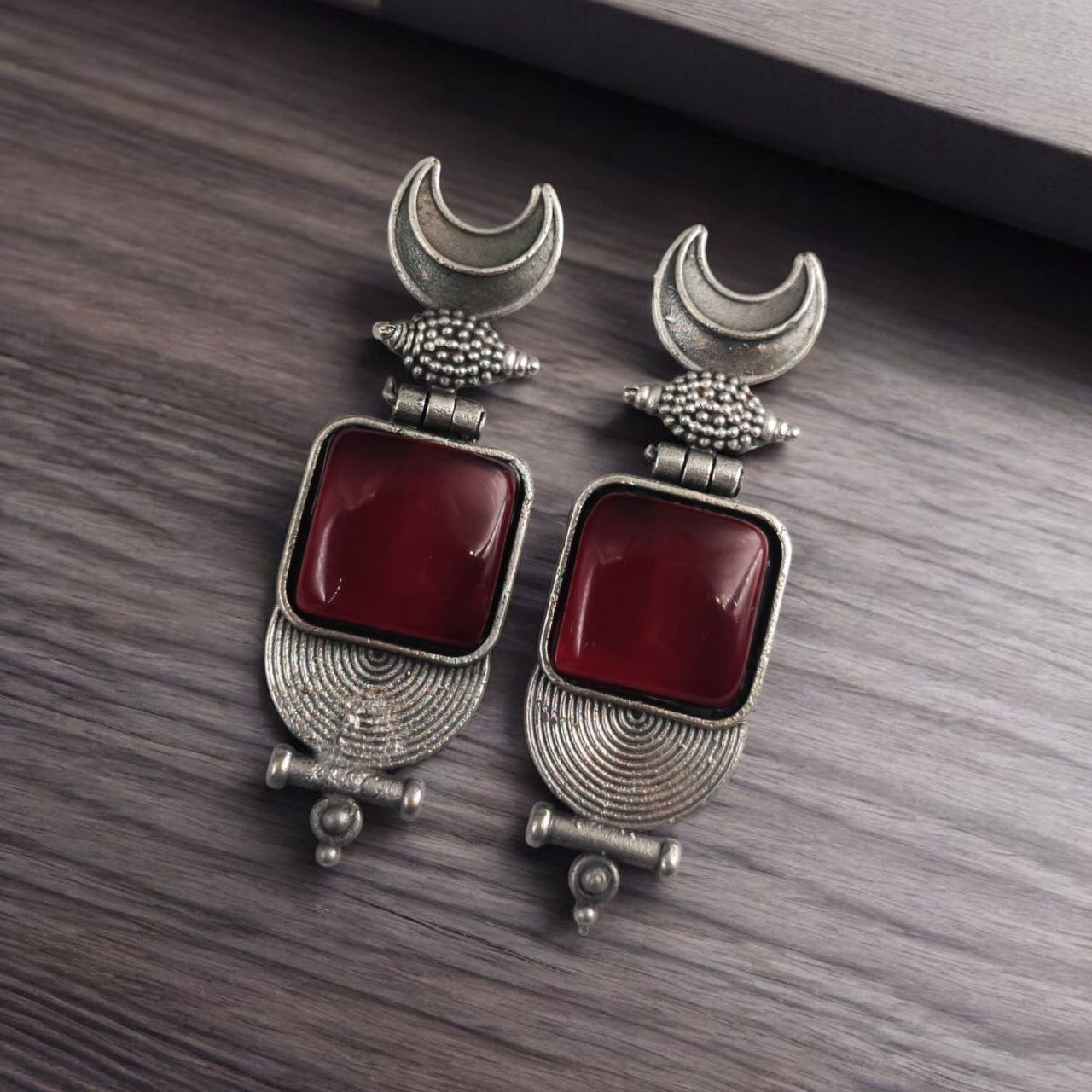Red Stunning Crescent Moon Designer Silver Oxidized Earring Drop Dangler Monalisa Stone Earrings for Women