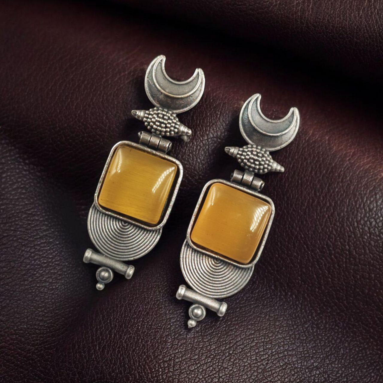 Yellow Stunning Crescent Moon Designer Silver Oxidized Earring Drop Dangler Monalisa Stone Earrings for Women