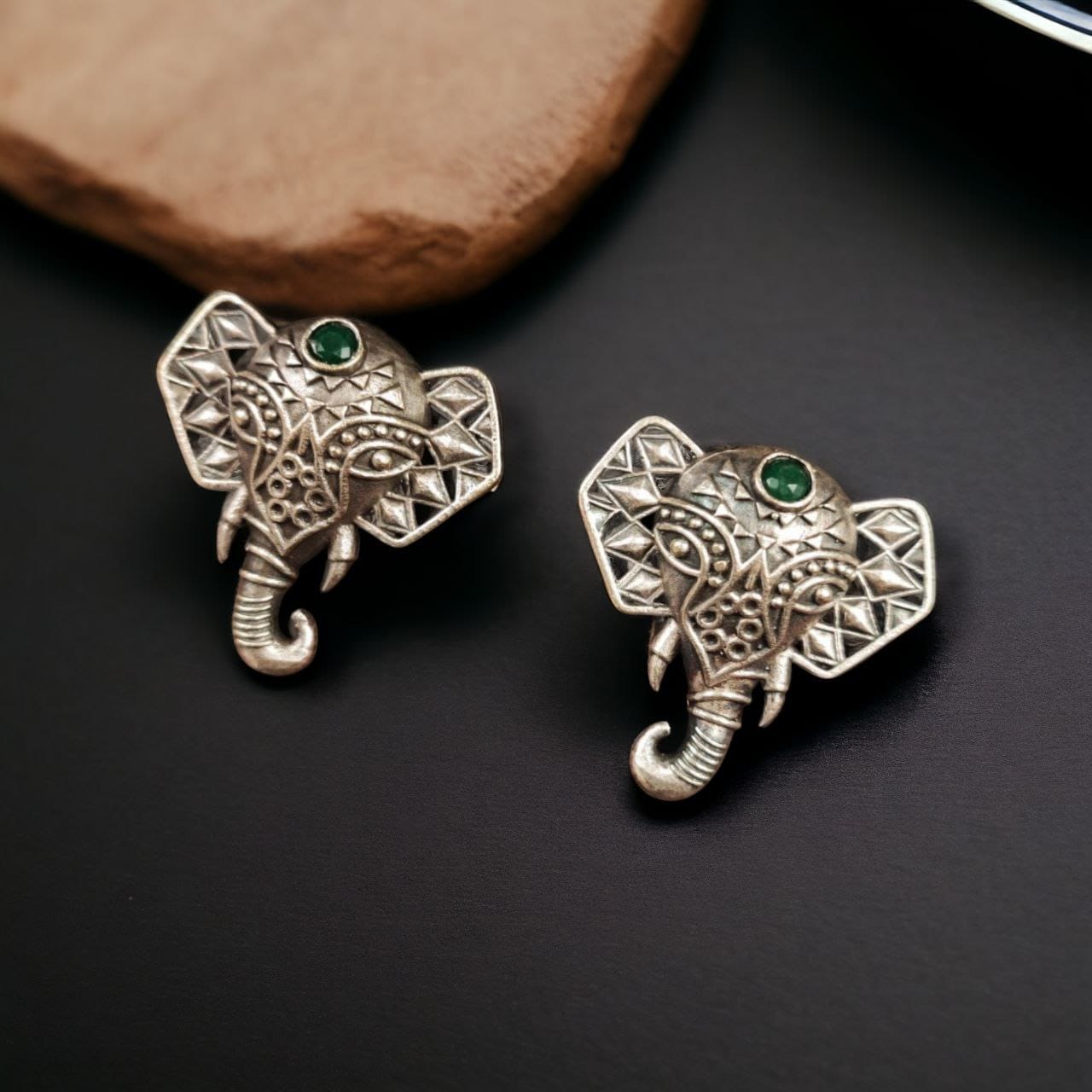 Green Exquisite Royal South Asian Elephant Silver Oxidized Earring Stud Top Boho Tribal Jewellery for Girls