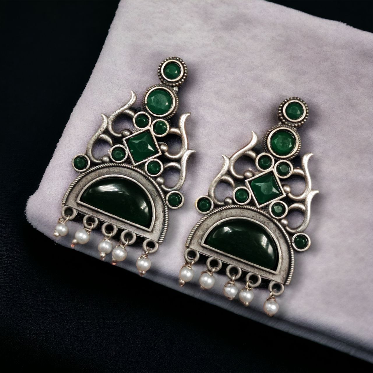 Green Stunning Bollywood Style Ethnic Earrings Dangler Silver Oxidised Stonework Pakistani Earring Set