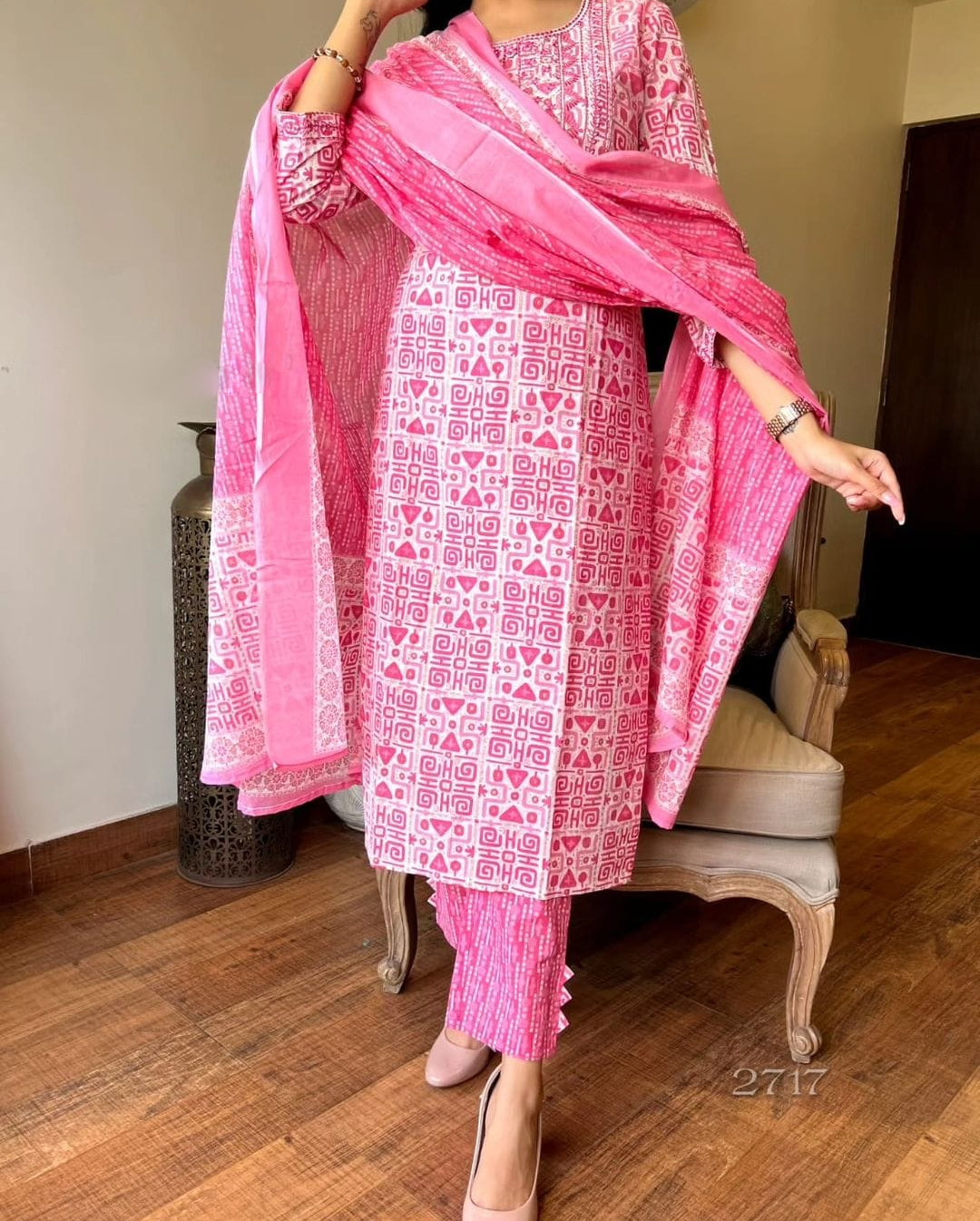 Beautiful Pink Bagru Print Cotton Kurti Pant Dupatta Set Salwar Kameez for Women (Set of 3)