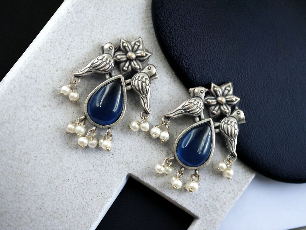 Blue Dainty Birds Rustic Silver Oxidized Monalisa Stone Stud Earring Set with Pearl Beads Drop