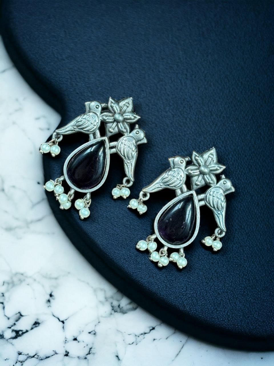 Purple Dainty Birds Rustic Silver Oxidized Monalisa Stone Stud Earring Set with Pearl Beads Drop