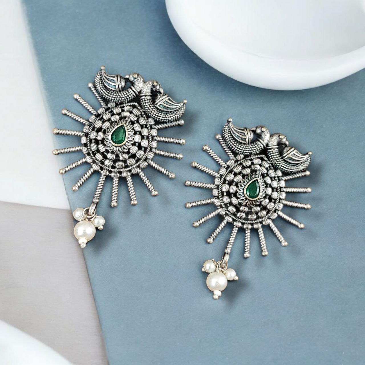 Green Exquisite Rustic Birds Silver Oxidized Designer Stud Earring Set with Pearl Beads Drop for Women
