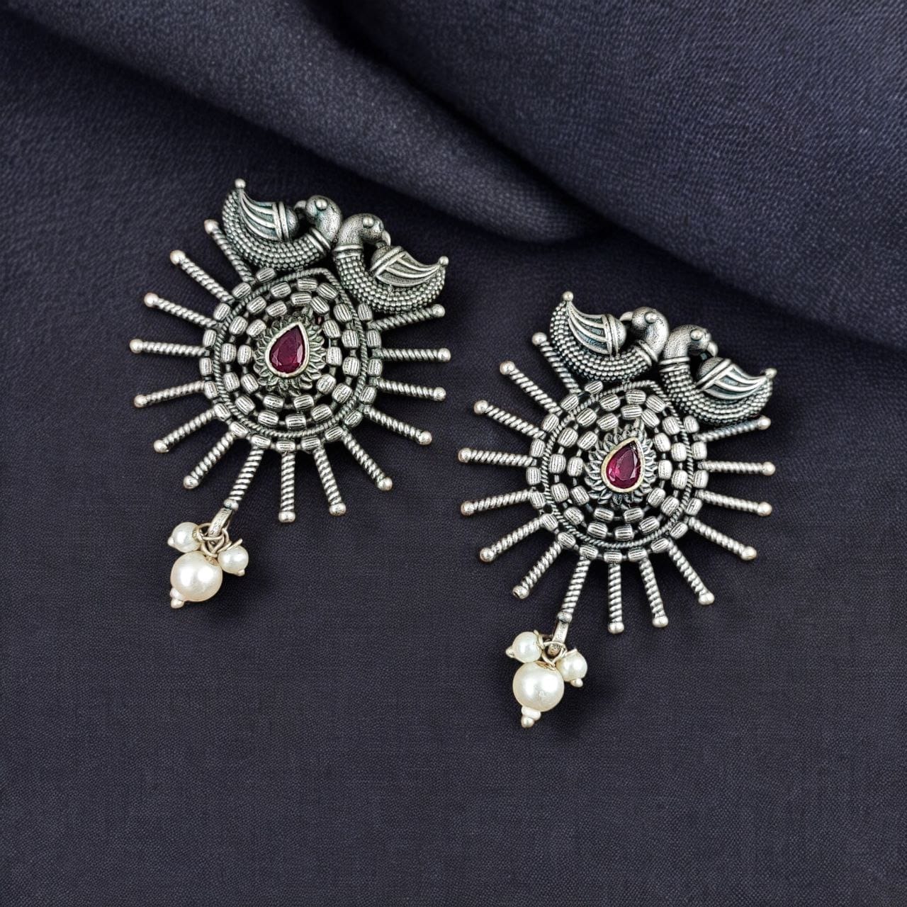 Exquisite Rustic Birds Silver Oxidized Designer Stud Earring Set with Pearl Beads Drop for Women