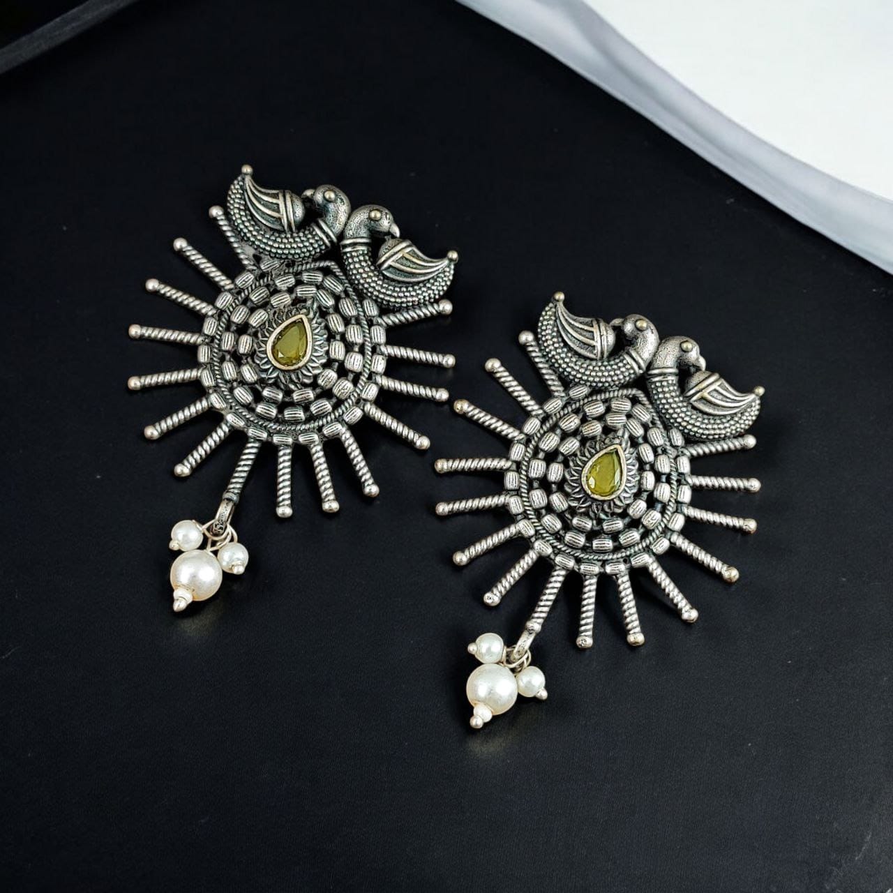 Yellow Exquisite Rustic Birds Silver Oxidized Designer Stud Earring Set with Pearl Beads Drop for Women