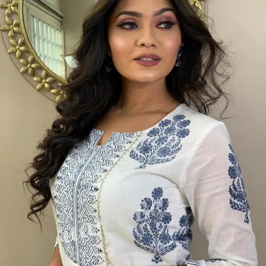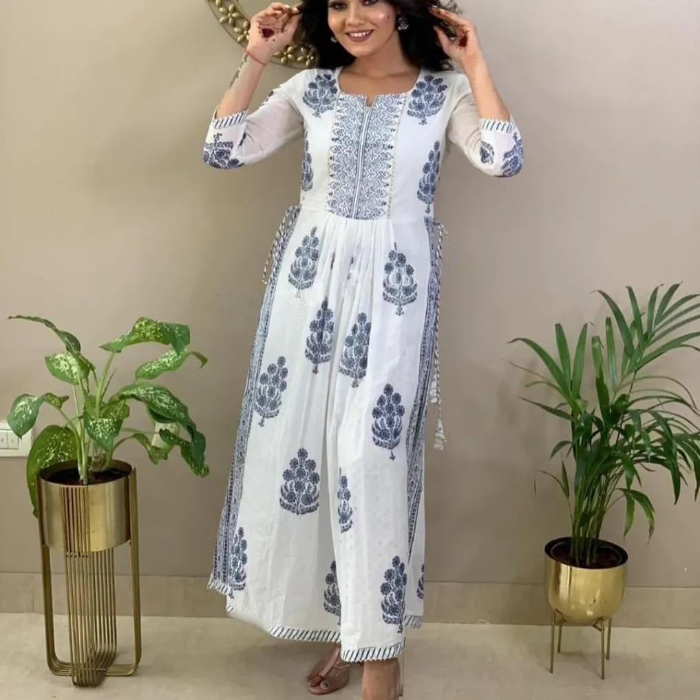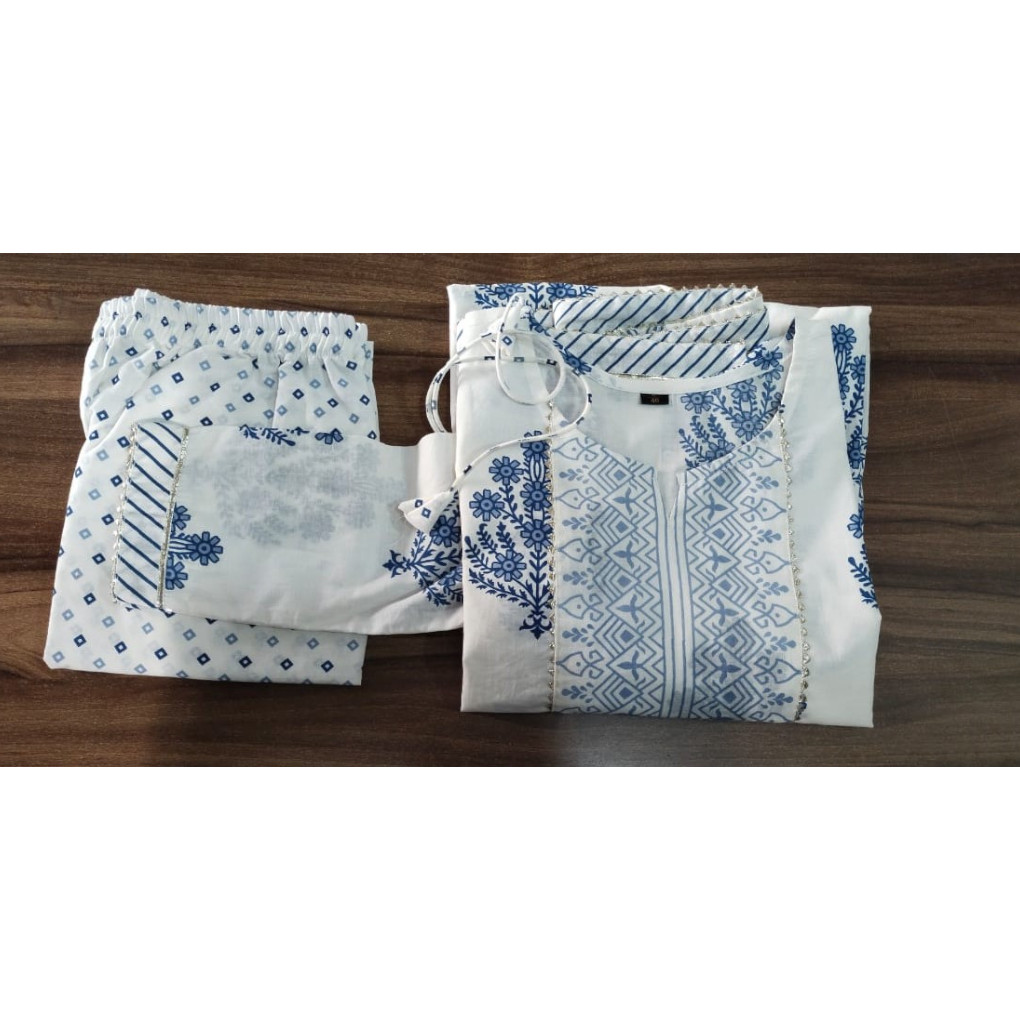 Blue Hand Block Print White Cotton Kurti Pant Nayra Side Slit Cut Salwar Kameez Set