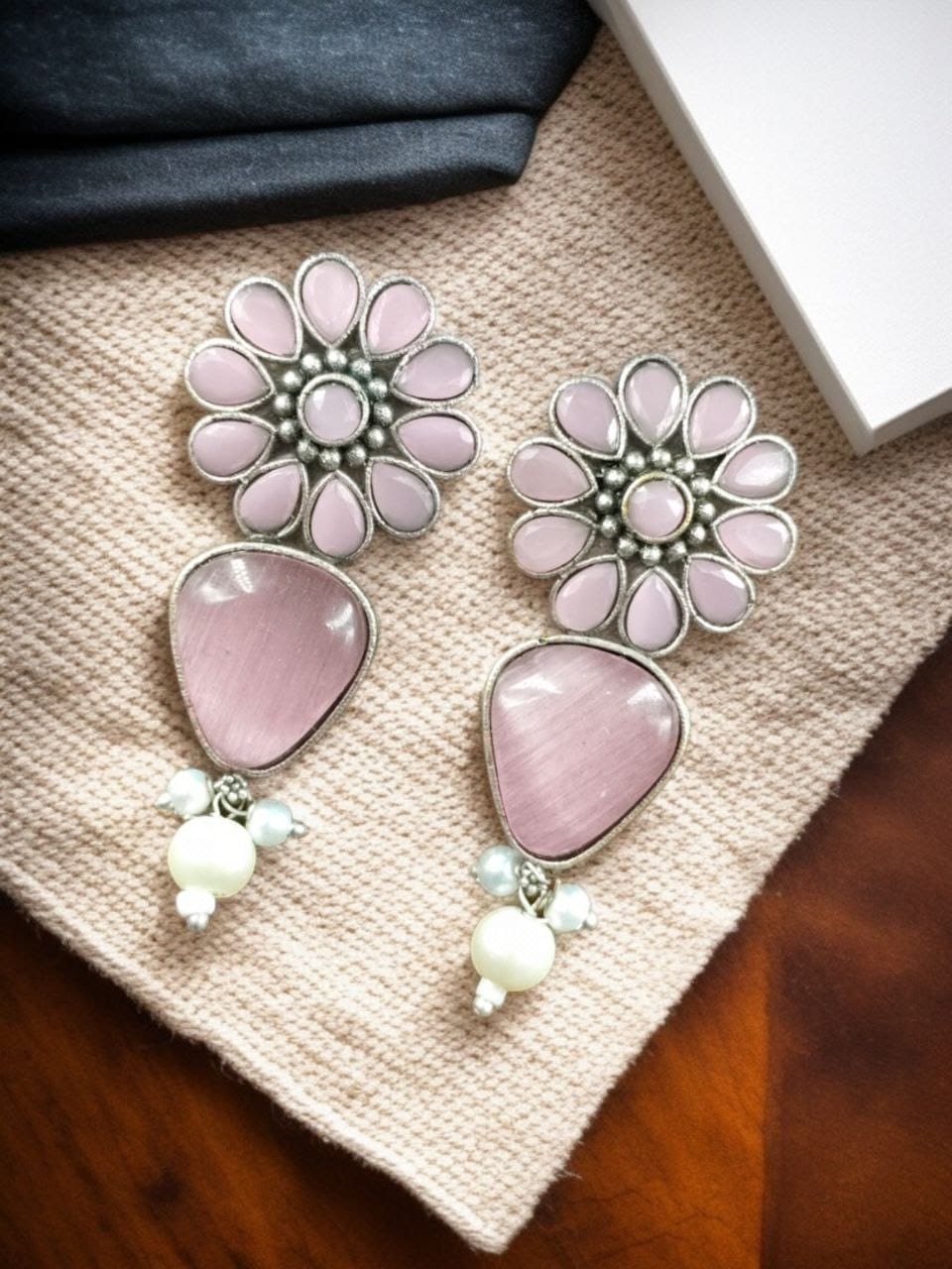 Baby Pink Attractive Ethnic Monalisa Stone Stud Earring Indian Silver-Toned Earring Set Pearl Beads Drop