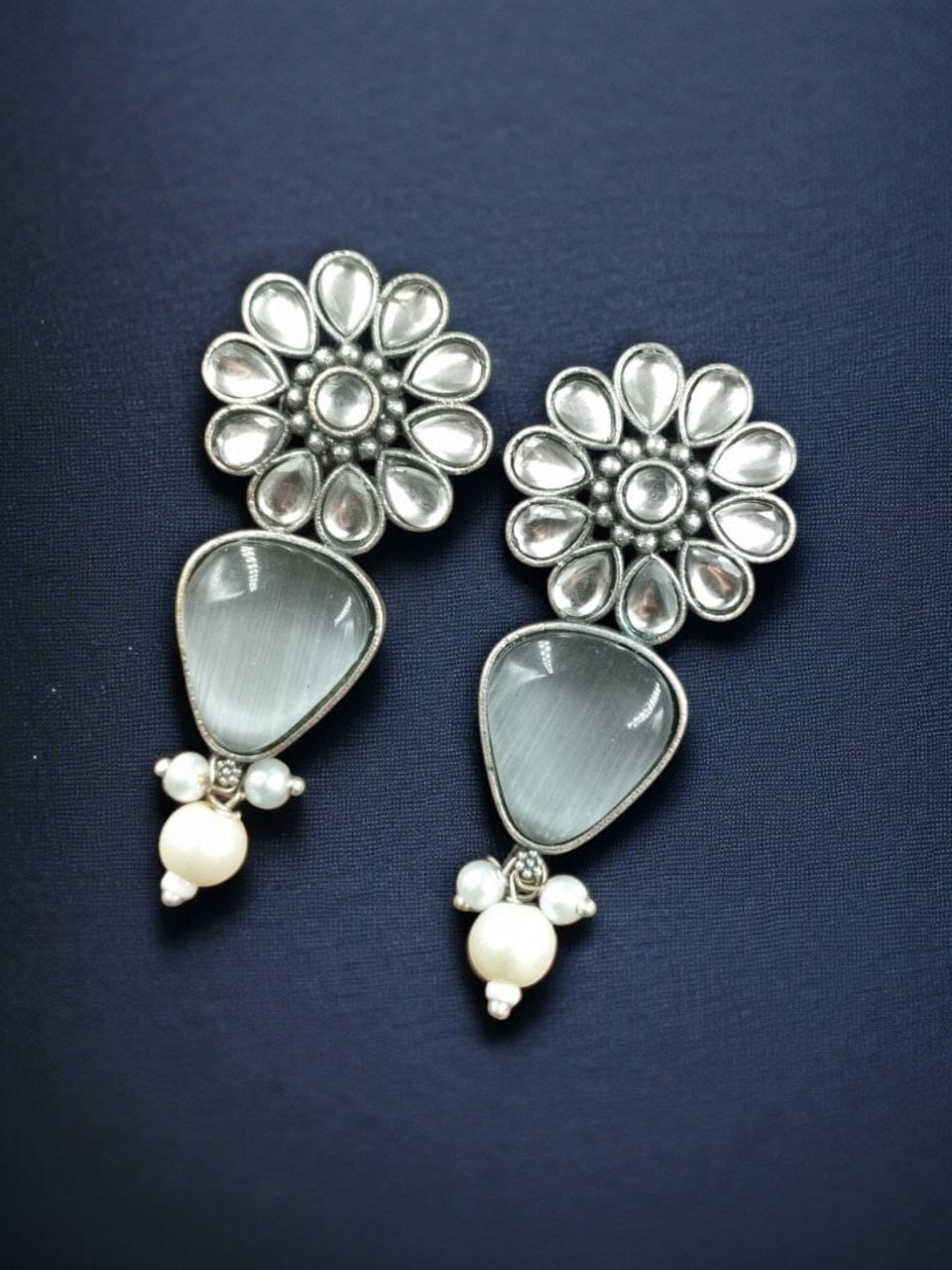 Grey Attractive Ethnic Monalisa Stone Stud Earring Indian Silver-Toned Earring Set Pearl Beads Drop
