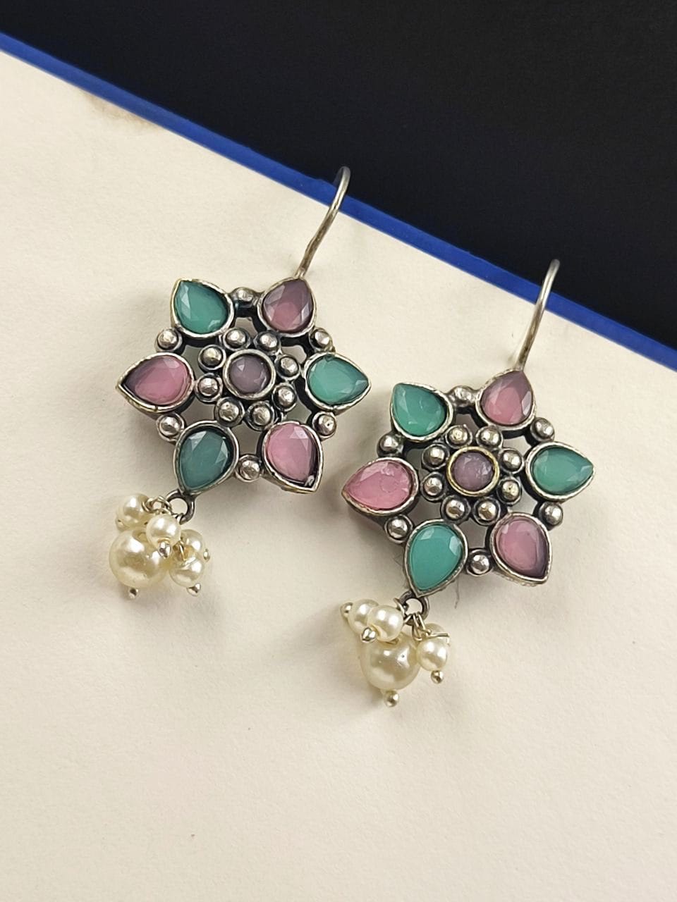 Baby Pink Mint Fashionable Silver-Toned Oxidized Brass Earring Hook Stonework Indian Earring Set Pearl Beads Drop