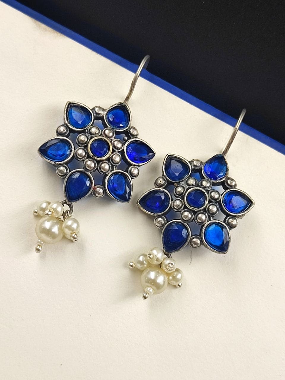 Blue Fashionable Silver-Toned Oxidized Brass Earring Hook Stonework Indian Earring Set Pearl Beads Drop